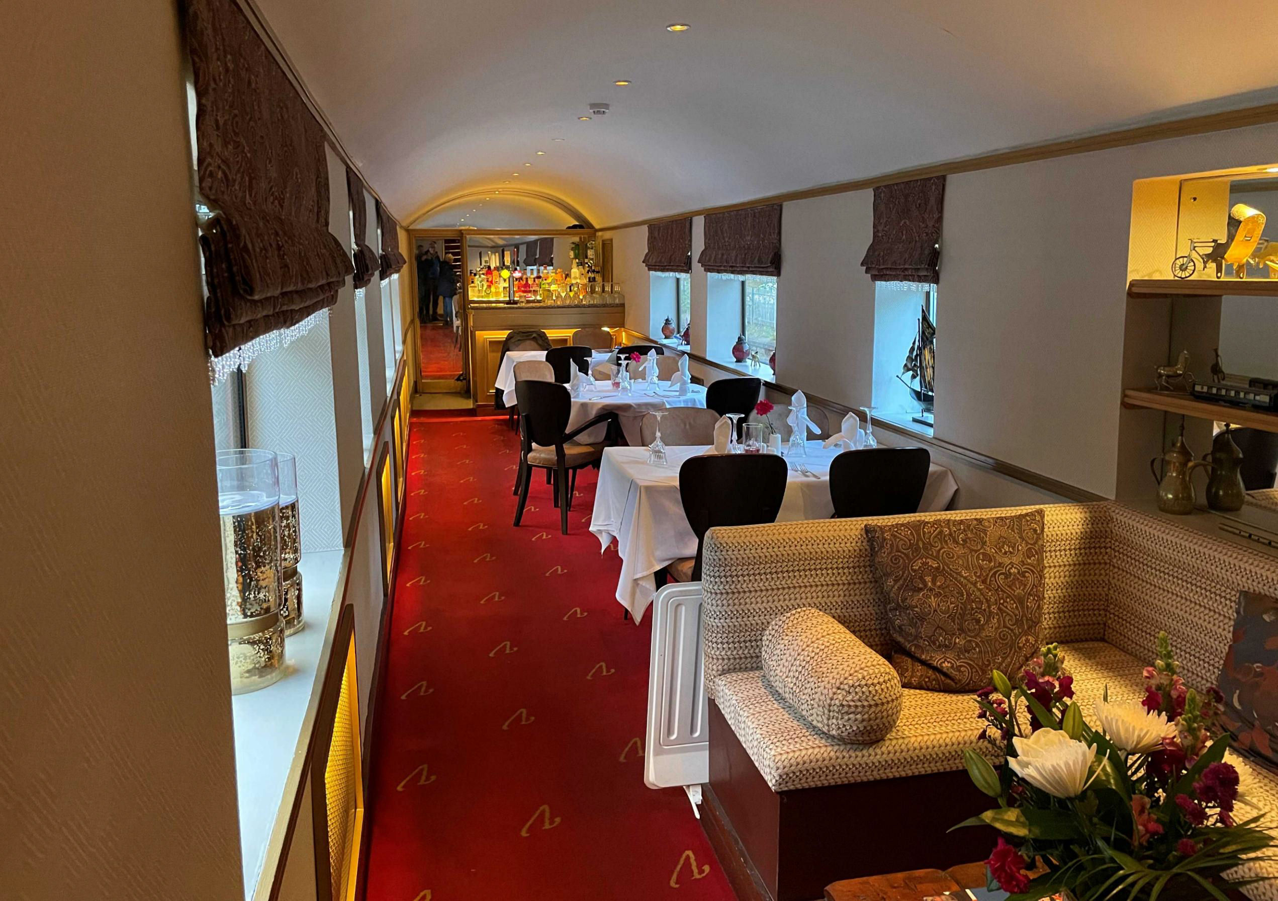 Through a large wooden door, we returned to the main broad passenger hallway, divided by two rows of columns, with curved ceilings. There was nothing left to do but collapse with a drink to enjoy the former First Class refreshment room, now the Centurion Bar, with columns, pilasters, coved ceiling, and (in an 1893 refurbishment) Burmantofts faience tiles - an apt, splendid location to end a magnificent day.