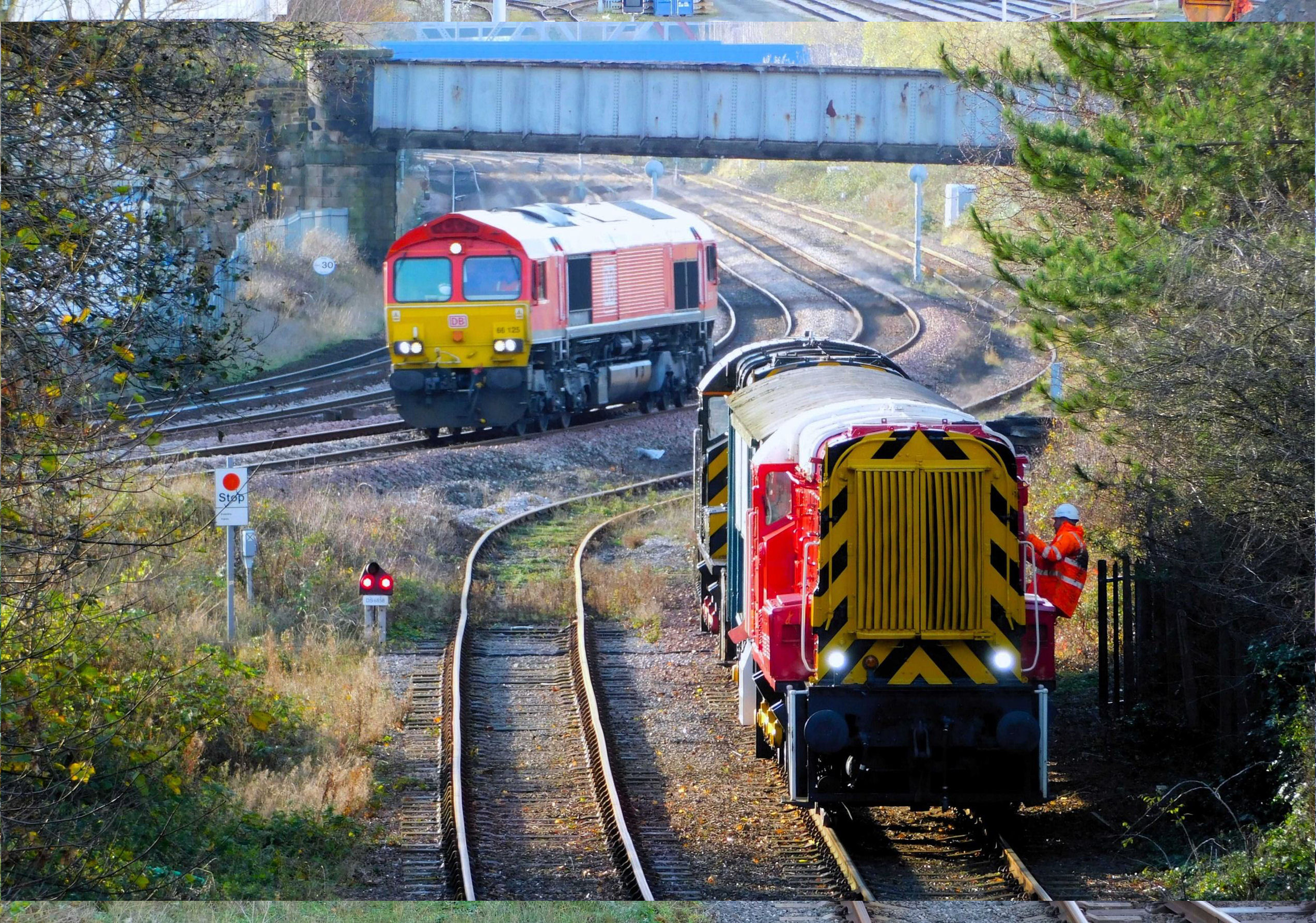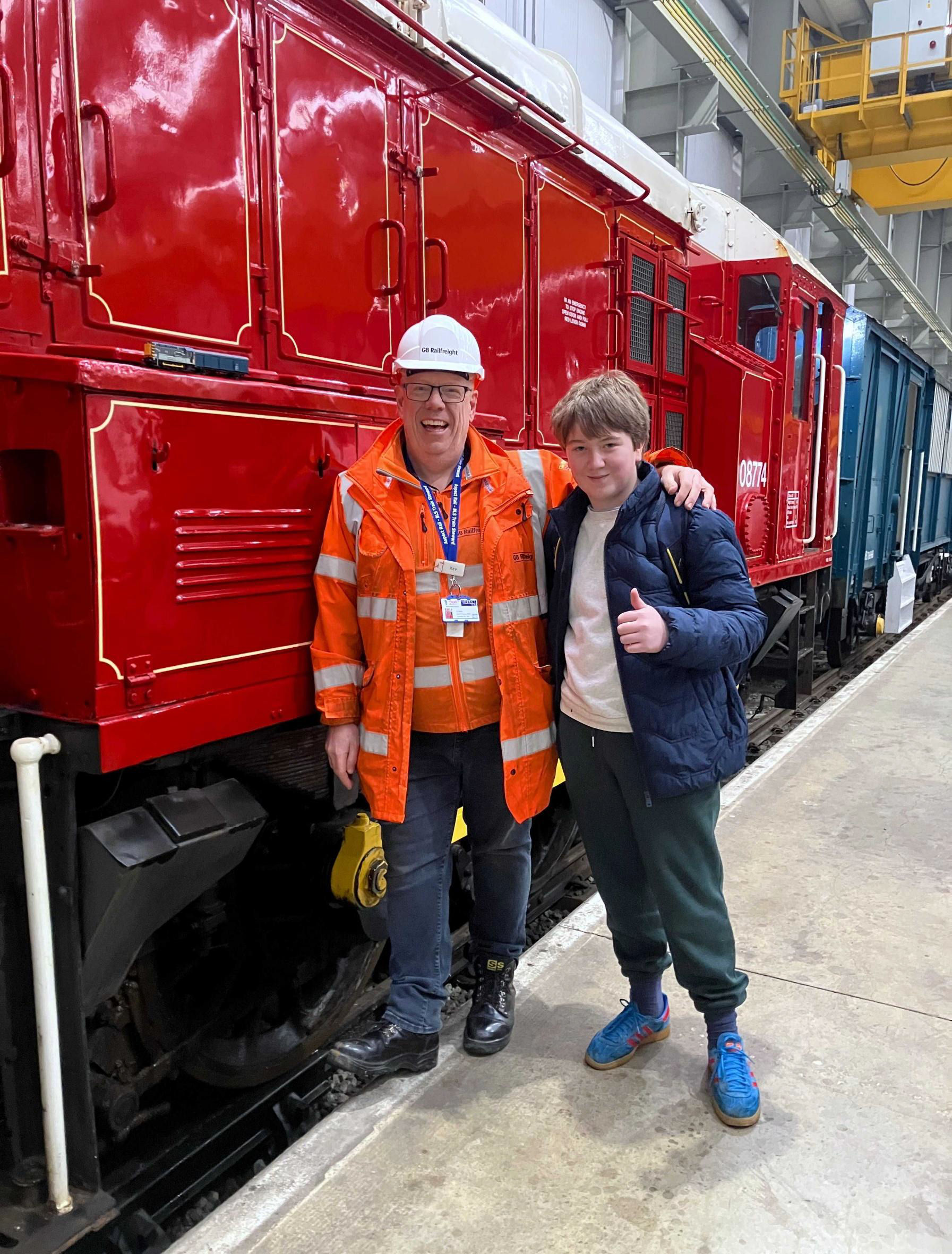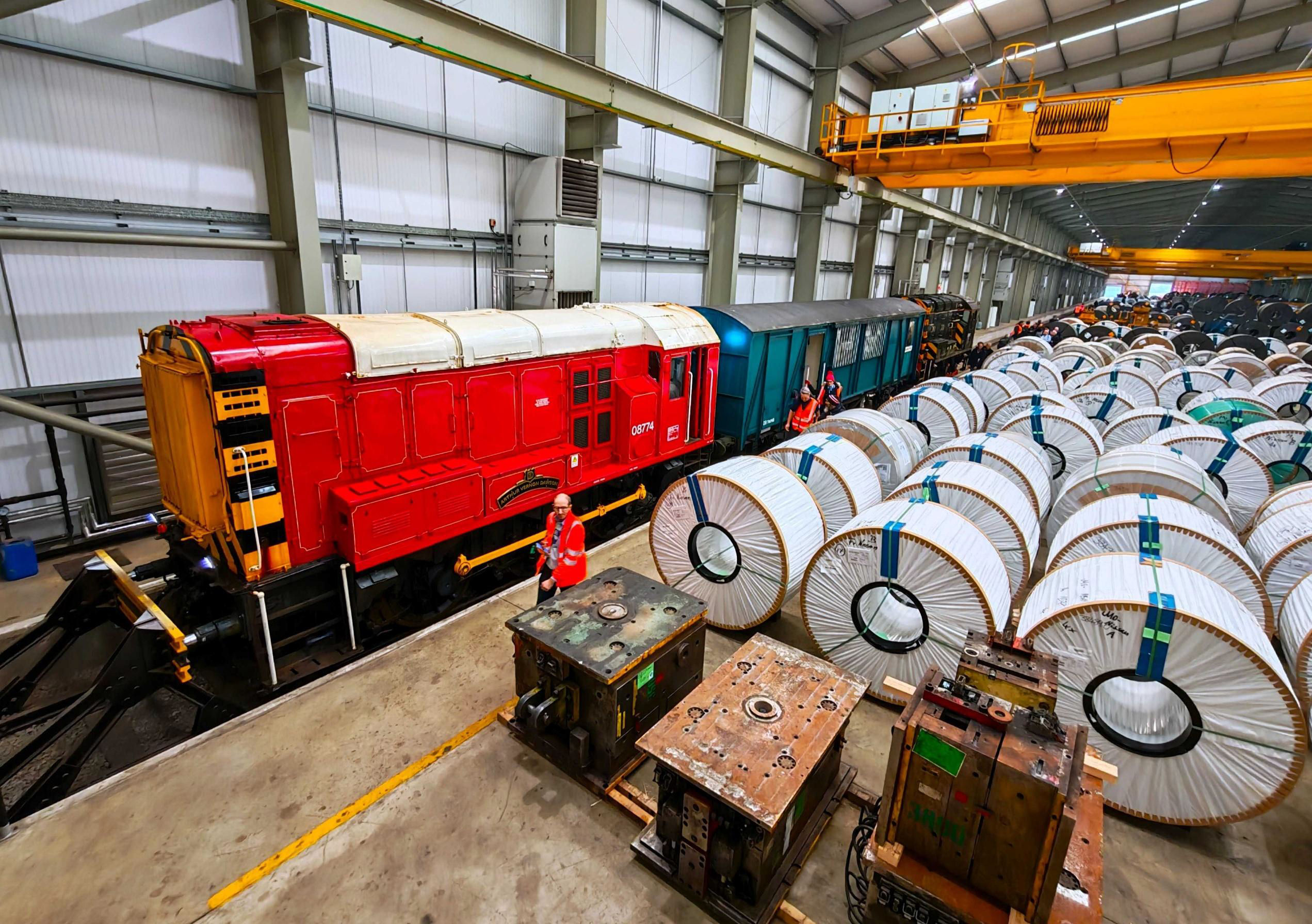 Charlie Nettle, Managing Director of AV Dawson, came to speak with the passengers on board. We asked him lots of questions and had a really good chat. At the end of the trip, our train terminated in the climate controlled coil storage shed where we'd started from. I took a picture with my model Class 08 positioned on the real Class 08 loco, before then leaving the site. We were given a friendly farewell by our Society stewards. Dad and I decided to take some lineside pictures of the second trip, from Metz Road Bridge and the level crossings dotted around the site. We met a few others with the same idea and also some old friends who came especially to photograph the train. A few passers-by stopped to enjoy the Class 08s travelling under Metz Road bridge and seemed to really enjoy the spectacle!