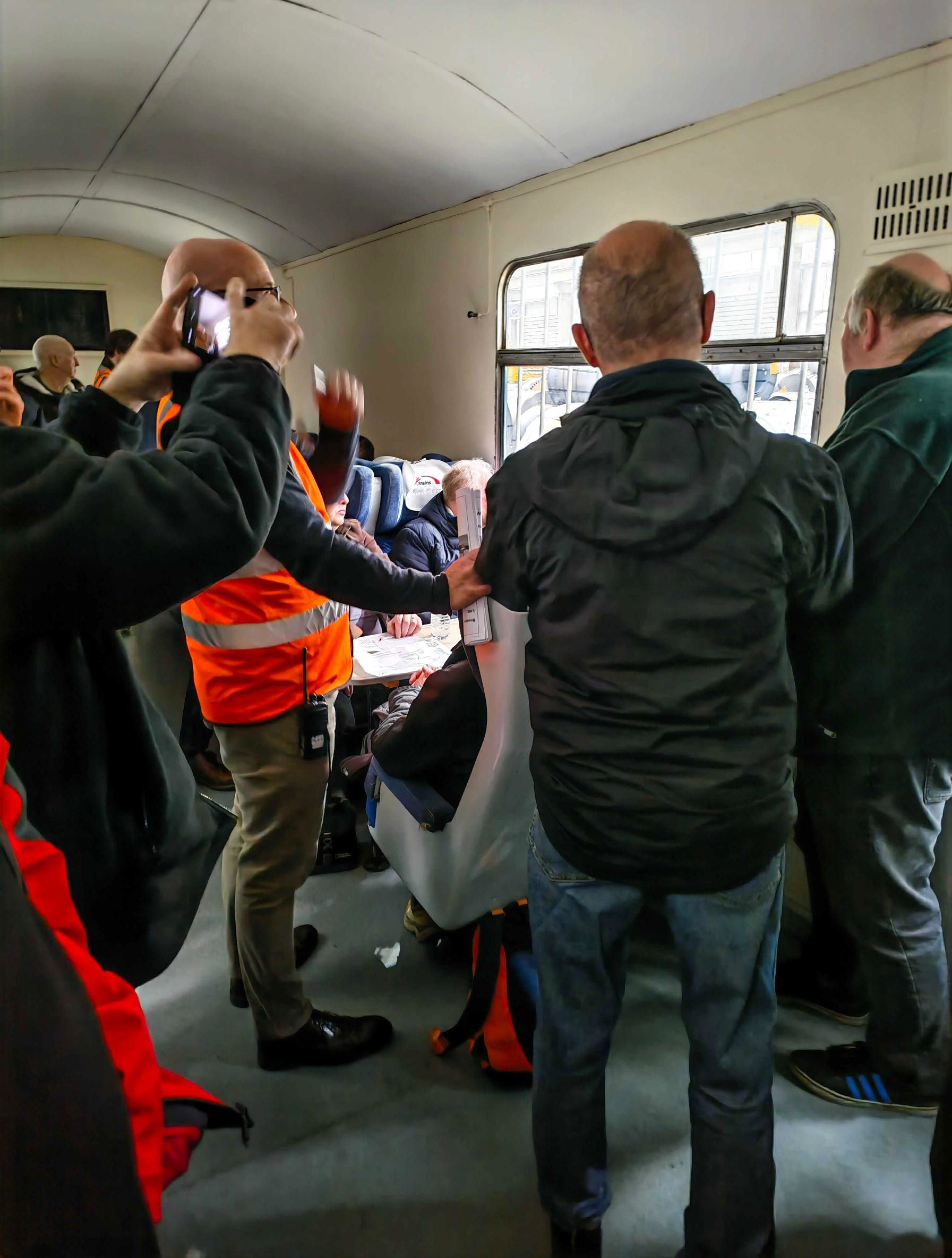Inside 'Molly' (named after Kev's dog and why not?), our standard gauge peripatetic riding vehicle a former British Rail mess van) during an AV Dawson railtour.