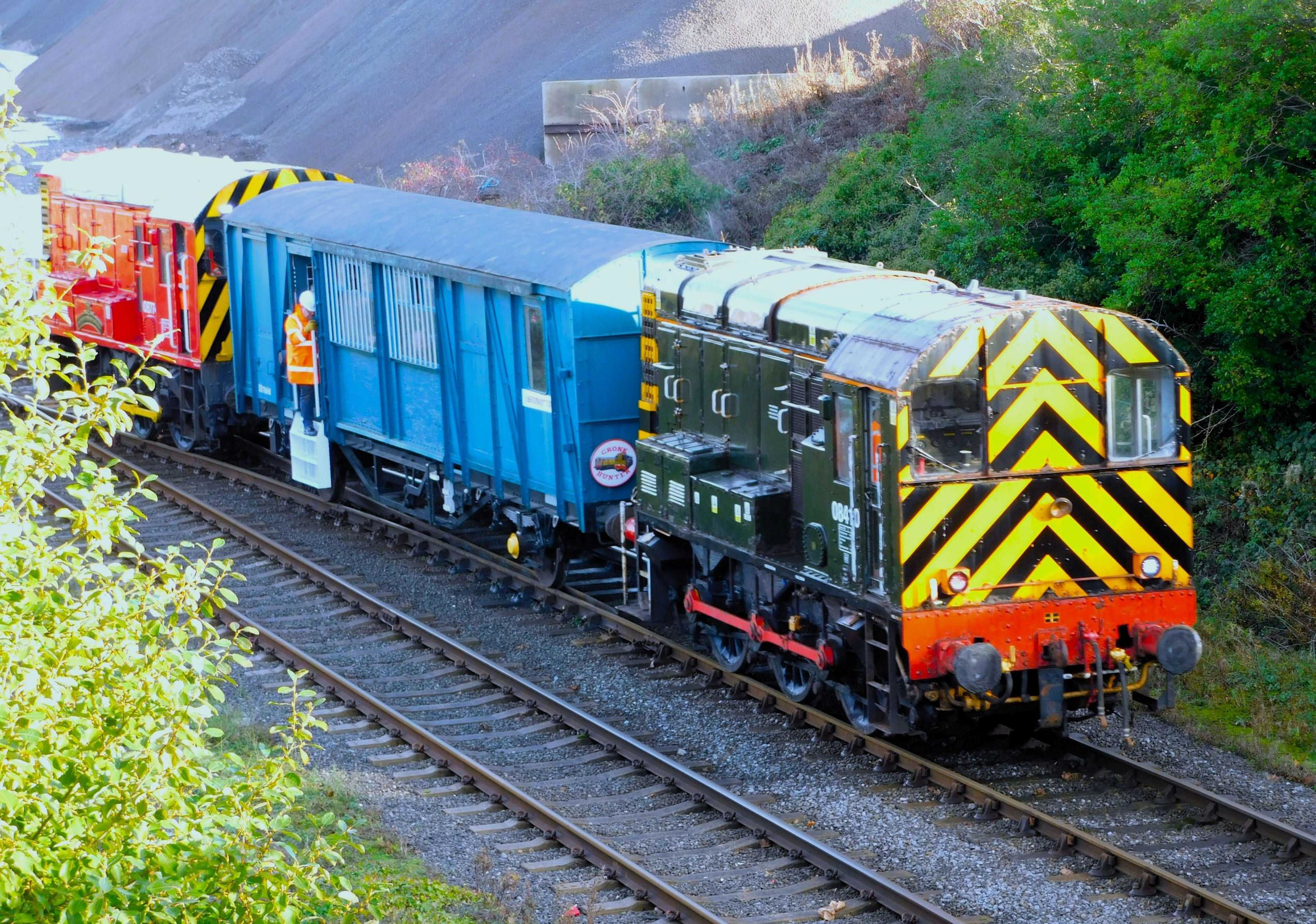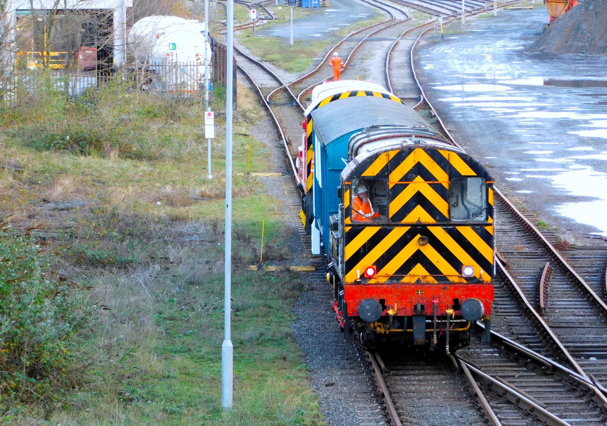 We then had a chat with other friends who had just arrived. Before we knew it, it was time to enter the Automotive Steel Storage Terminal where we could take pictures of the train, from a set of stairs and also at platform level. 08410 was to lead the first leg of the trip, with 08774 on the rear and 'Molly' sandwiched in the middle, full of Society members. We then climbed aboard Molly; pretty much the last people to board, as we had taken lots of pictures! After the whistle was blown, we departed but almost immediately stopped again as 08774 on the rear seemed to have its brakes on. This was quickly fixed and 08410 on the front made a shaky start out of the shed as we ran up to the Network Rail boundary.