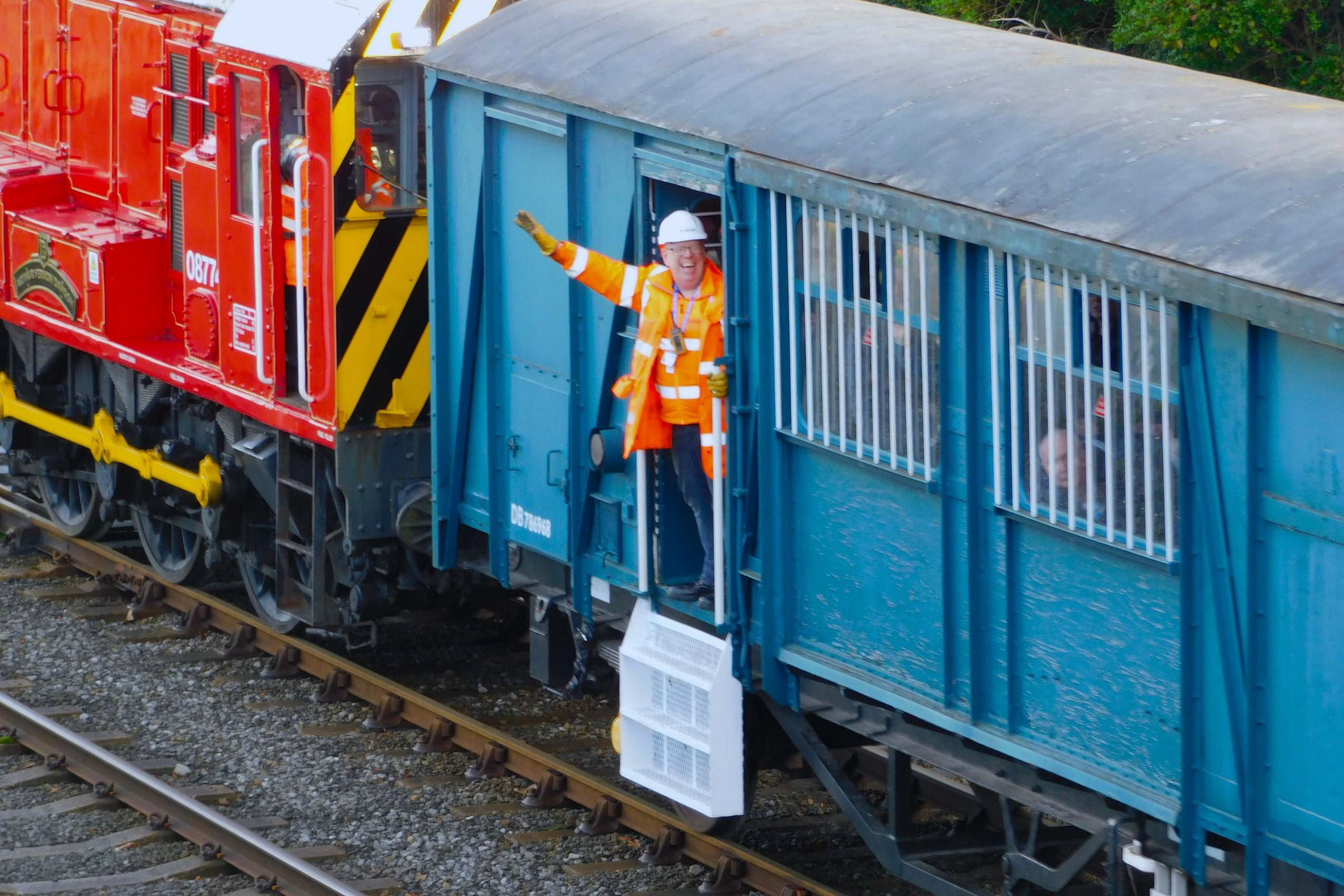 The train guard (who looks vaguely familiar!) gives a friendly wave.