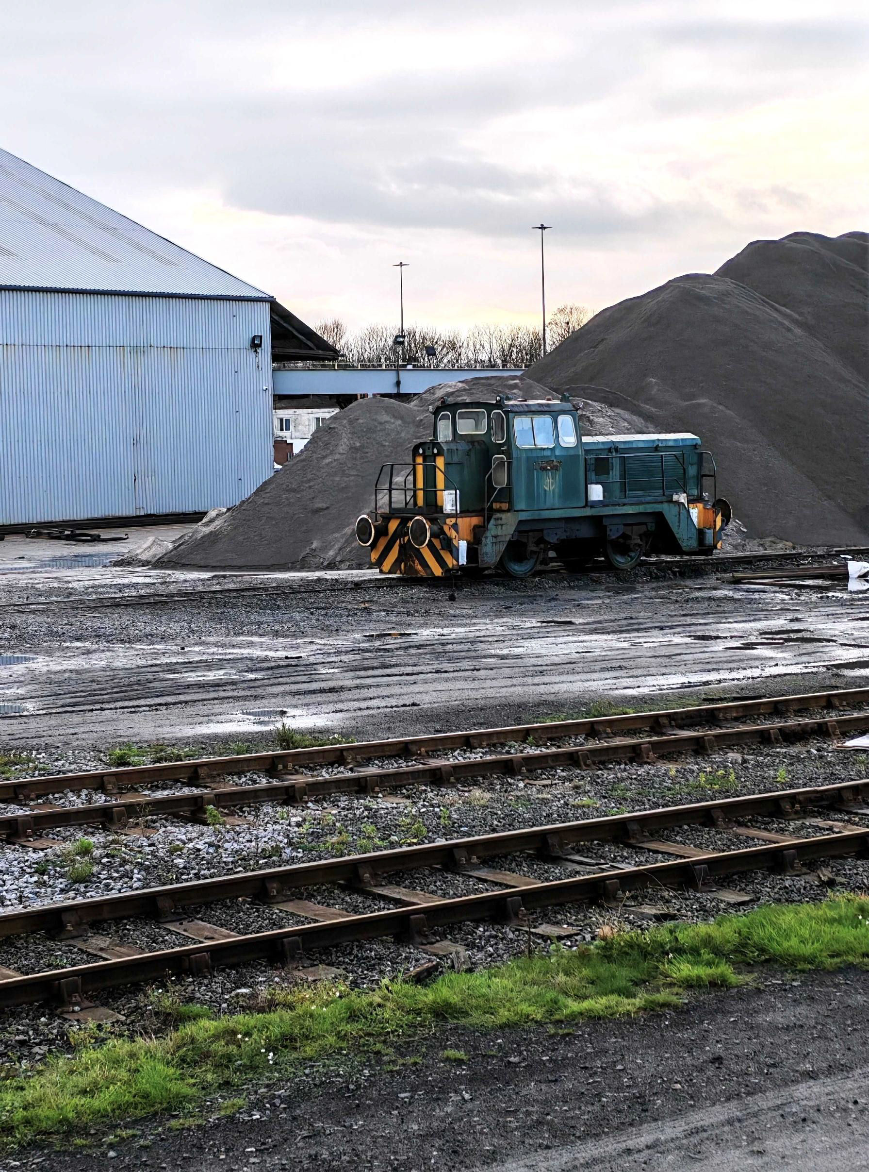 Next, we proceeded back off the wharf to the Cobra Terminal (new track for most on the tour, as AV Dawson had taken this area over after our previous tour on 1 Jul 2018), where huge piles of rock salt are delivered by rail and road. We went through the loading terminal to the end of the line here. Our tour later went round to the Warehouse area, via another level crossing to reach this, again lots of people watched us cross over the road, once more supervised by Martyn Brailsford (or his identical twin).