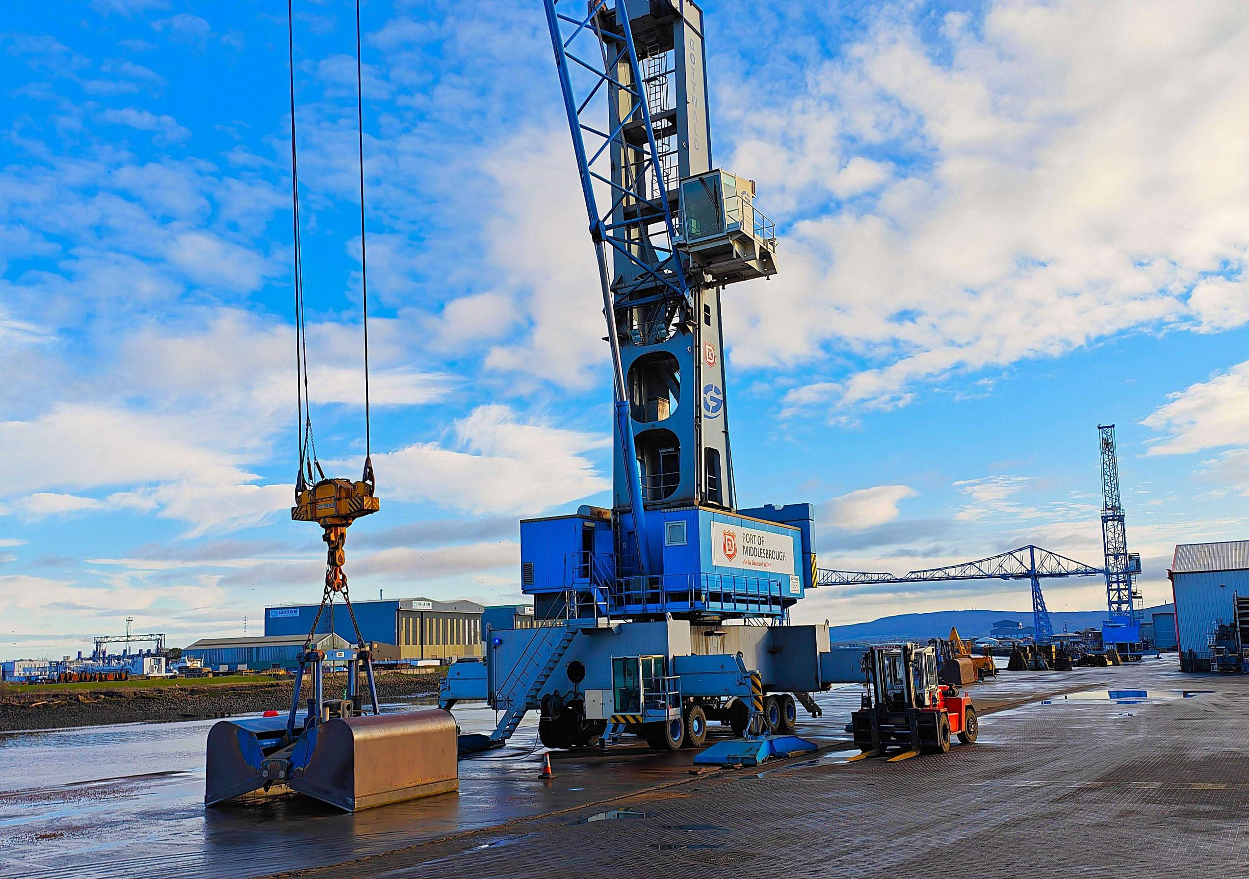 River Tees wharfside with Middlesbrough Transporter Bridge (closed and at risk of collapse) behind.