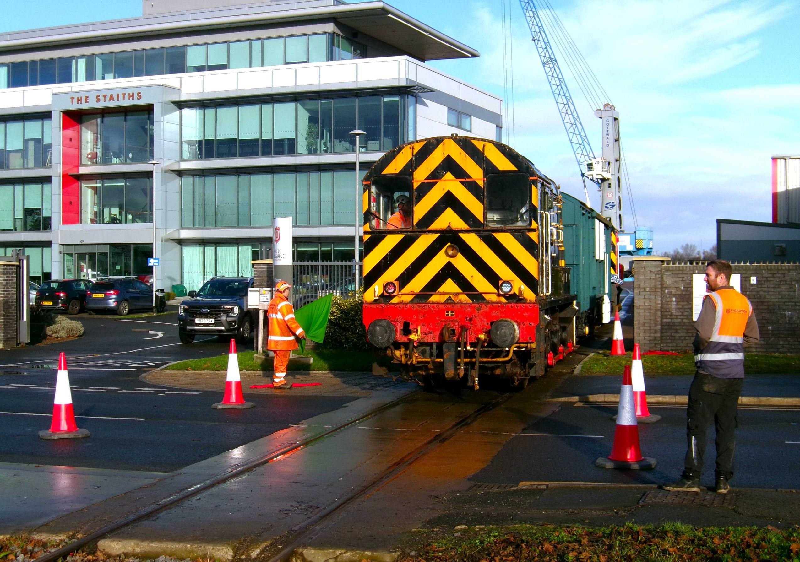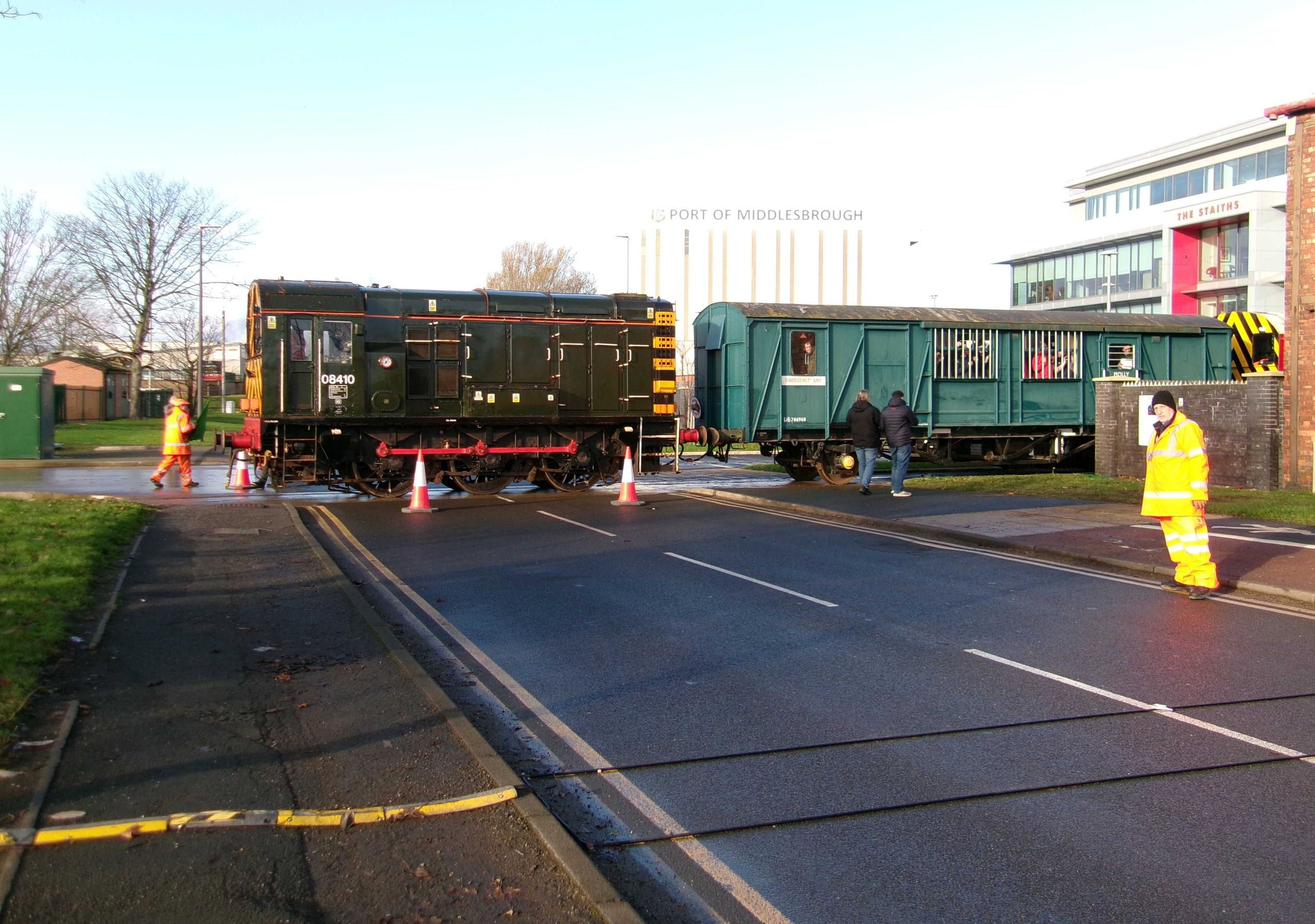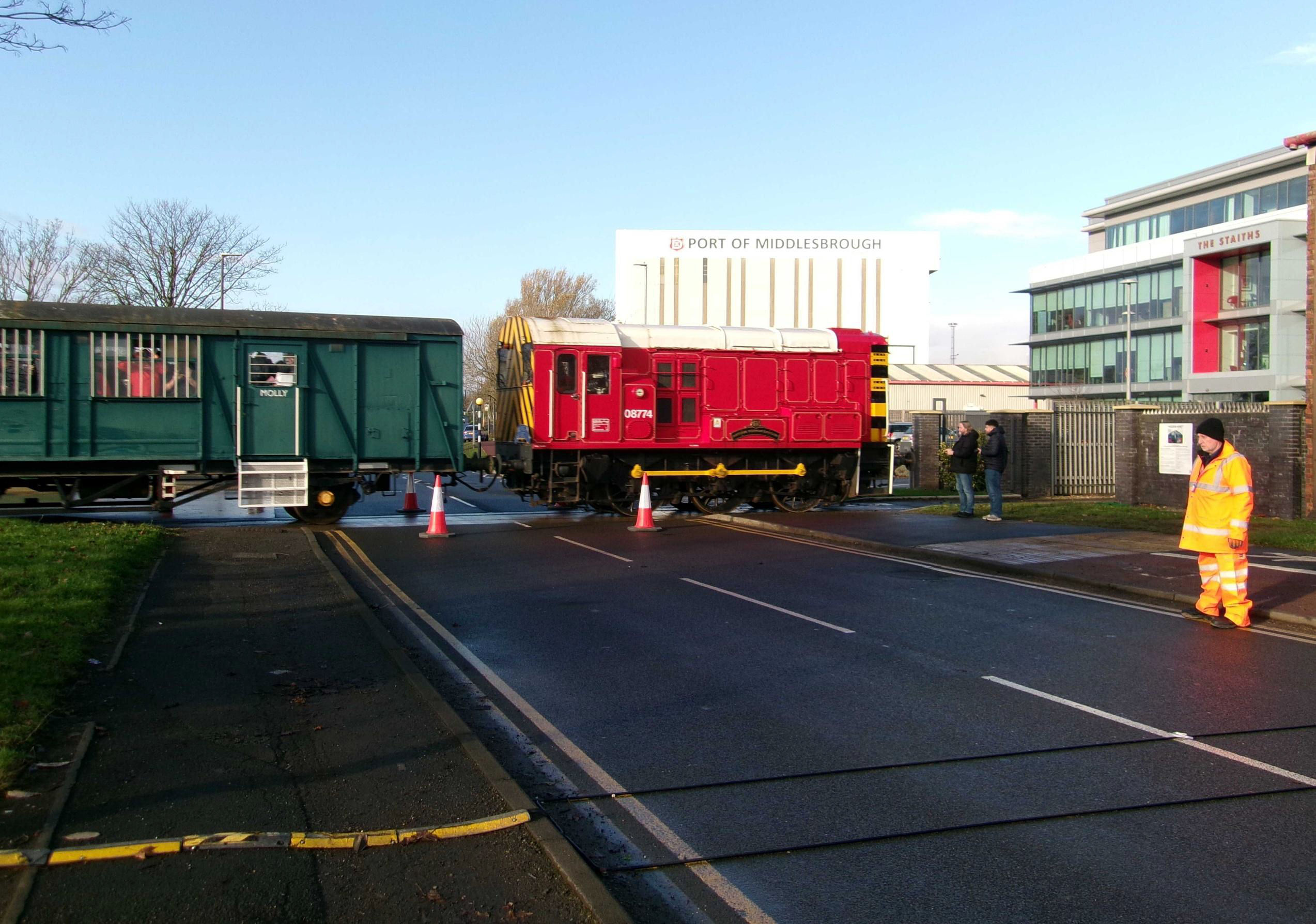 08774 then took us back to Tees Riverside Intermodal Park (end of the inner siding). I observed that we then returned to the Network boundary, on a different track, the one nearest Middlesbrough station. Next, we went to the North Sea Supply Base Wharf on the River Tees, including crossing the road outside AV Dawson (Martyn Brailsford was the level crossing keeper), with many spectators watching us.