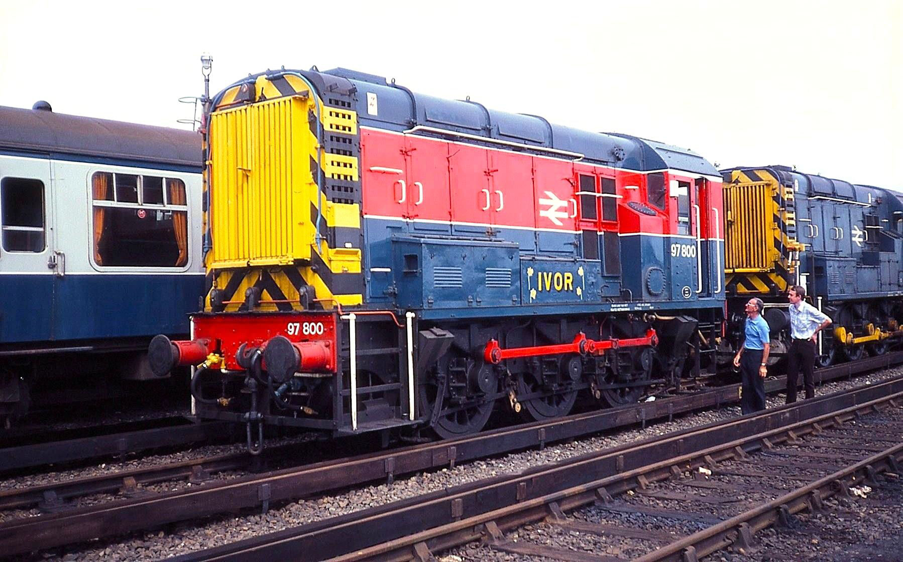 08600 during its Slade Green period. It was renumbered in the departmental series as 97800 and painted in departmental livery, though later reverted to its old number and was in Network SouthEast livery. This was Chart Leacon Open Day on 14 Aug 1982 (third rail not live!). The loco ran from Slade Green to Ashford and back under its own power, not by lorry, quite a journey at 15mph. Note the name and the daffodils!