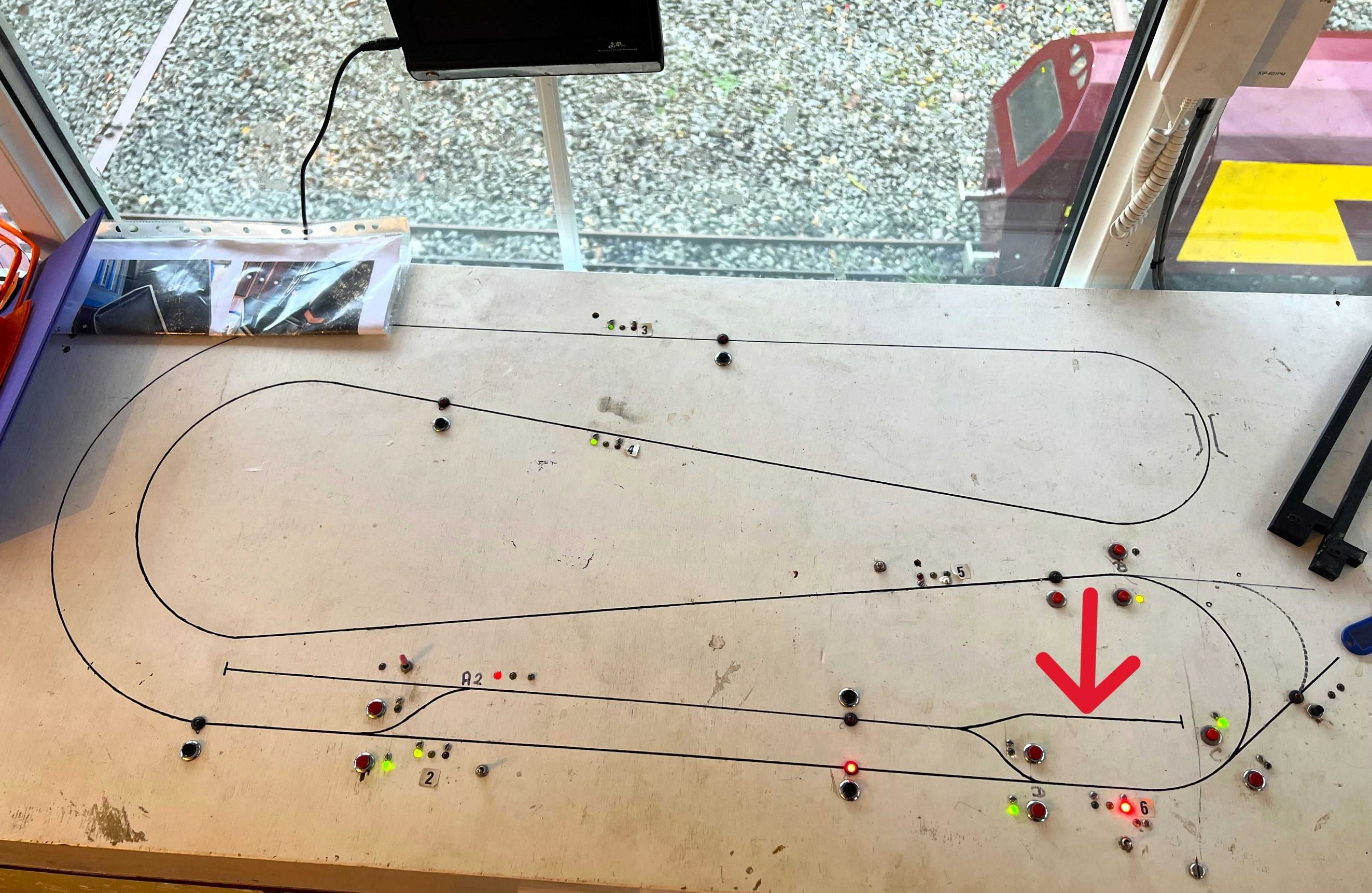 The highly sophisticated signal box panel for the ground level 7¼" gauge railway - Network Rail eat your heart out. The siding with a red arrow has gone, the dotted curve is disused (but we did it after some negotiation and devegetation. The shed branch (not all shown) is off right.