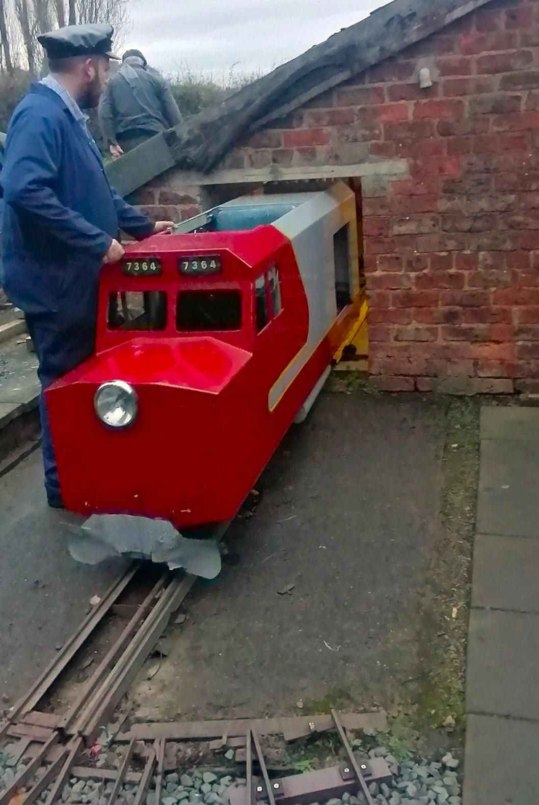 We started our visit by completing the main 7¼" ground level circuit twice - normal track and the station avoiding loop with full overlap, using the Class 67 'Ian Hall'. Public passenger running involves alighting at arrivals P2 and departing from P1 ahead (the two are continuous), although with a polite request, those who wish can usually stay on. Next, we did the station loop headshunt to the buffers with Battery Locomotive 7364, their largest (physical size) loco currently which only just fits though the shed opening!