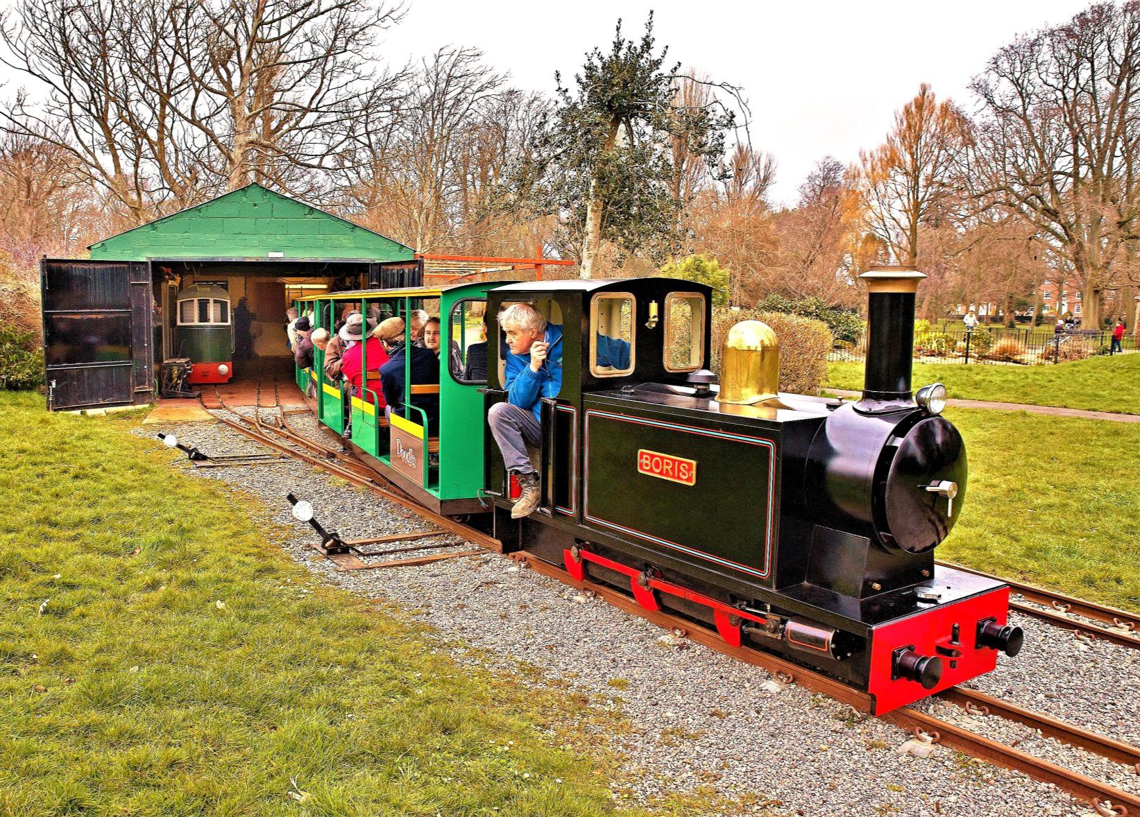 35 participants assembled on the recently refurbished, restored (at a cost of £2.5M) and now very smart Bognor Regis [the place once described as 'the last resort'] station concourse, and were met by a representative of the railway. He took us the most direct route, about 10 minutes walk to Hotham Park. The railway was running for the public so we awaited arrival of the train on the circuit and boarded. This working was reserved for us, much to the surprise and amusement of regular potential passengers and people in the park watching.