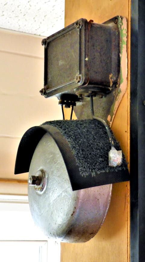 Another distinctive feature of Rhyl box was the large 'Train Running Away' bell to alert signallers (loudly!) in case of unauthorised train movements past the Down intermediate block Home signal 14. As can be seen it is complete with a bespoke muffling system. The box is three floors high; the interlocking was on the intermediate level. At least one member present suggested that access to the box might be via the scary looking external ladder, but thankfully it was only an emergency escape route and we climbed the internal wooden staircase! Mark also kindly showed us the distinctive LNWR interlocking in most of the boxes. At locations such as Rhyl, weights are directly attached to the locking - presumably to ensure reliable operation.