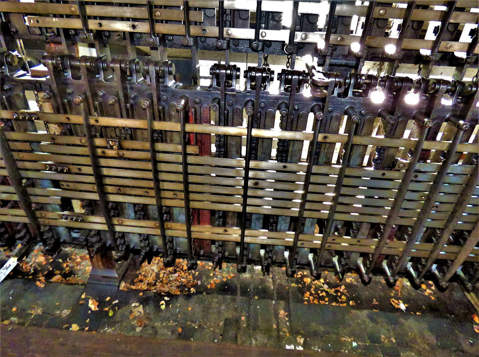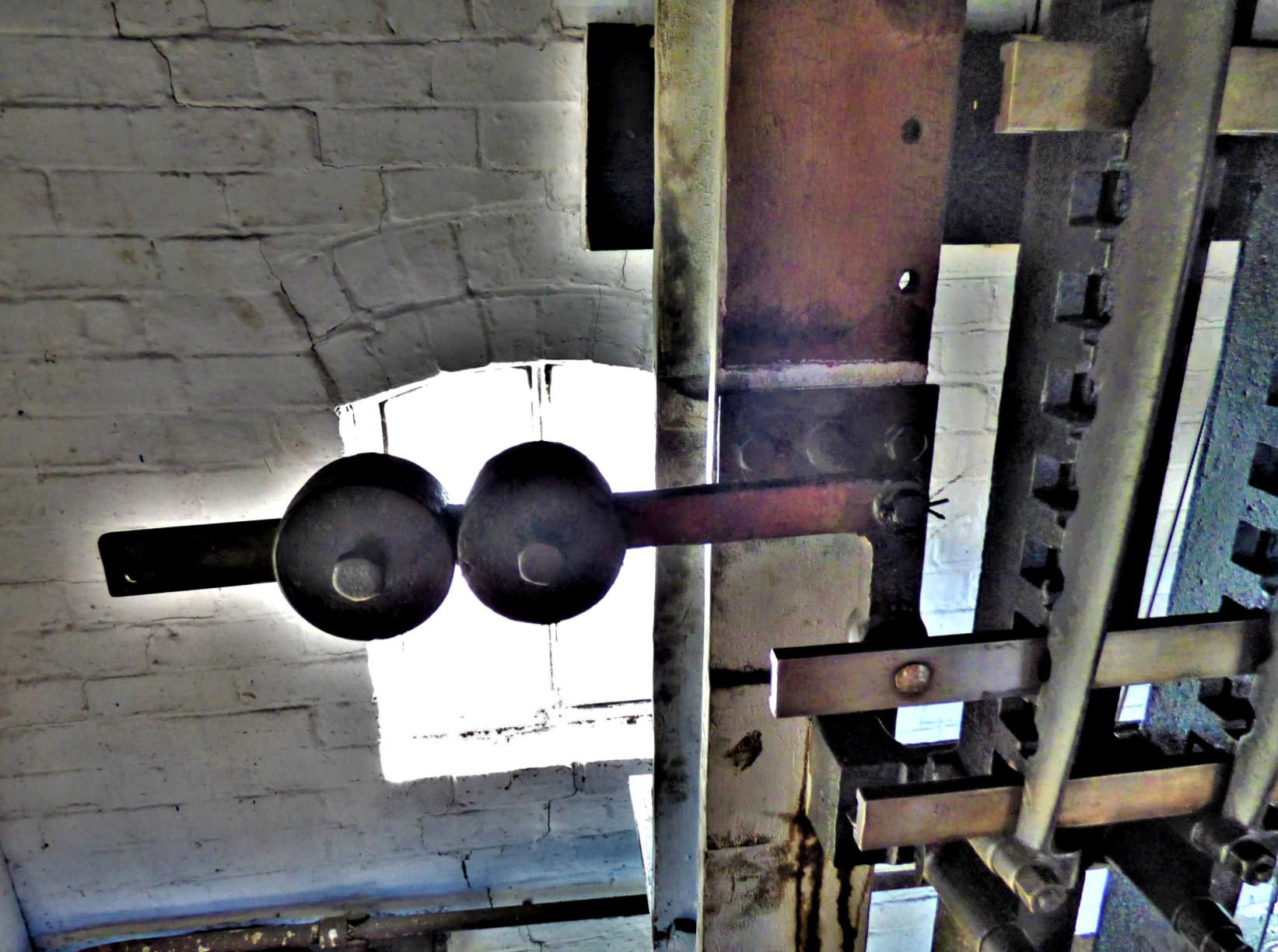 Rarely seen by non-signal box aficionados, the mysteries of Rhyl locking room, beneath the signal frame, showing weights directly attached to the locking (see report above).