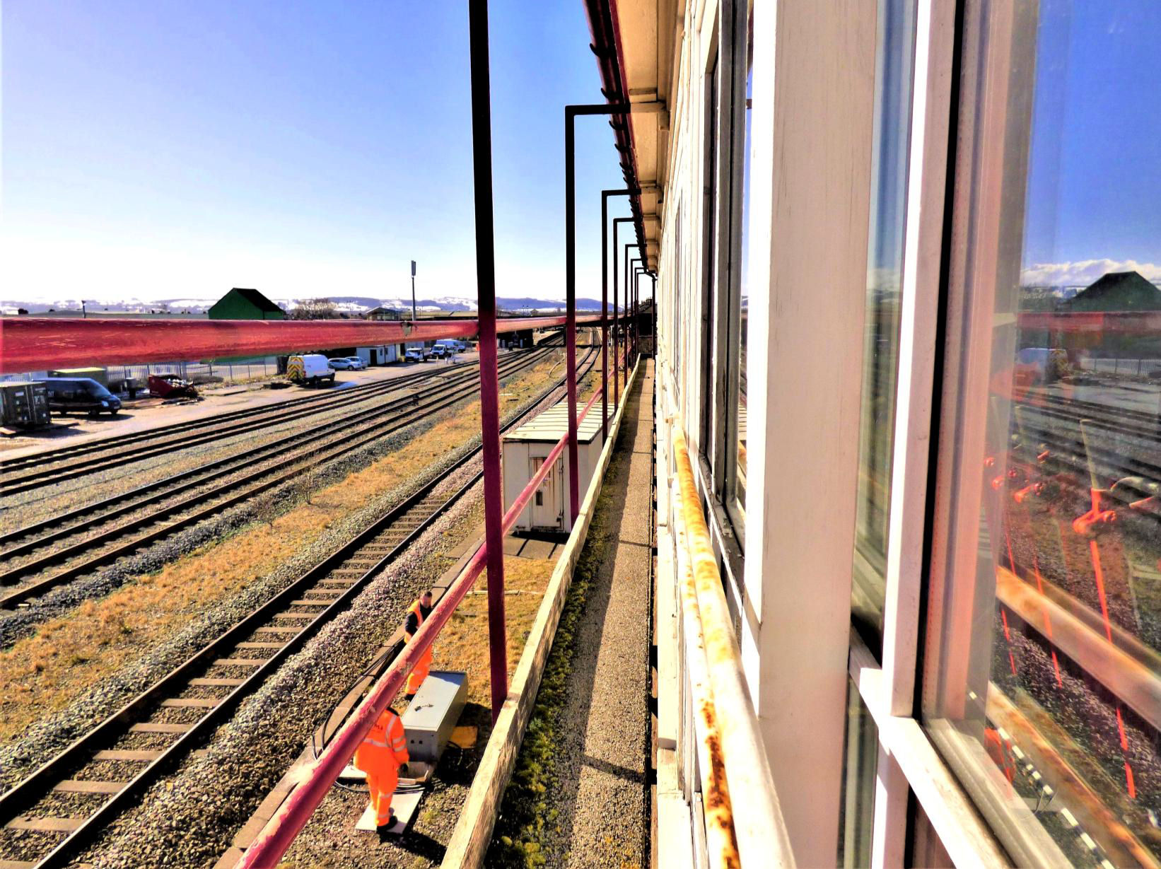 View of the line and station from the remarkably narrow balcony of Rhyl signal box. Left to right are the two Engineer's Sidings, Down passenger Loop, Down Main (no platform) and Up Main.