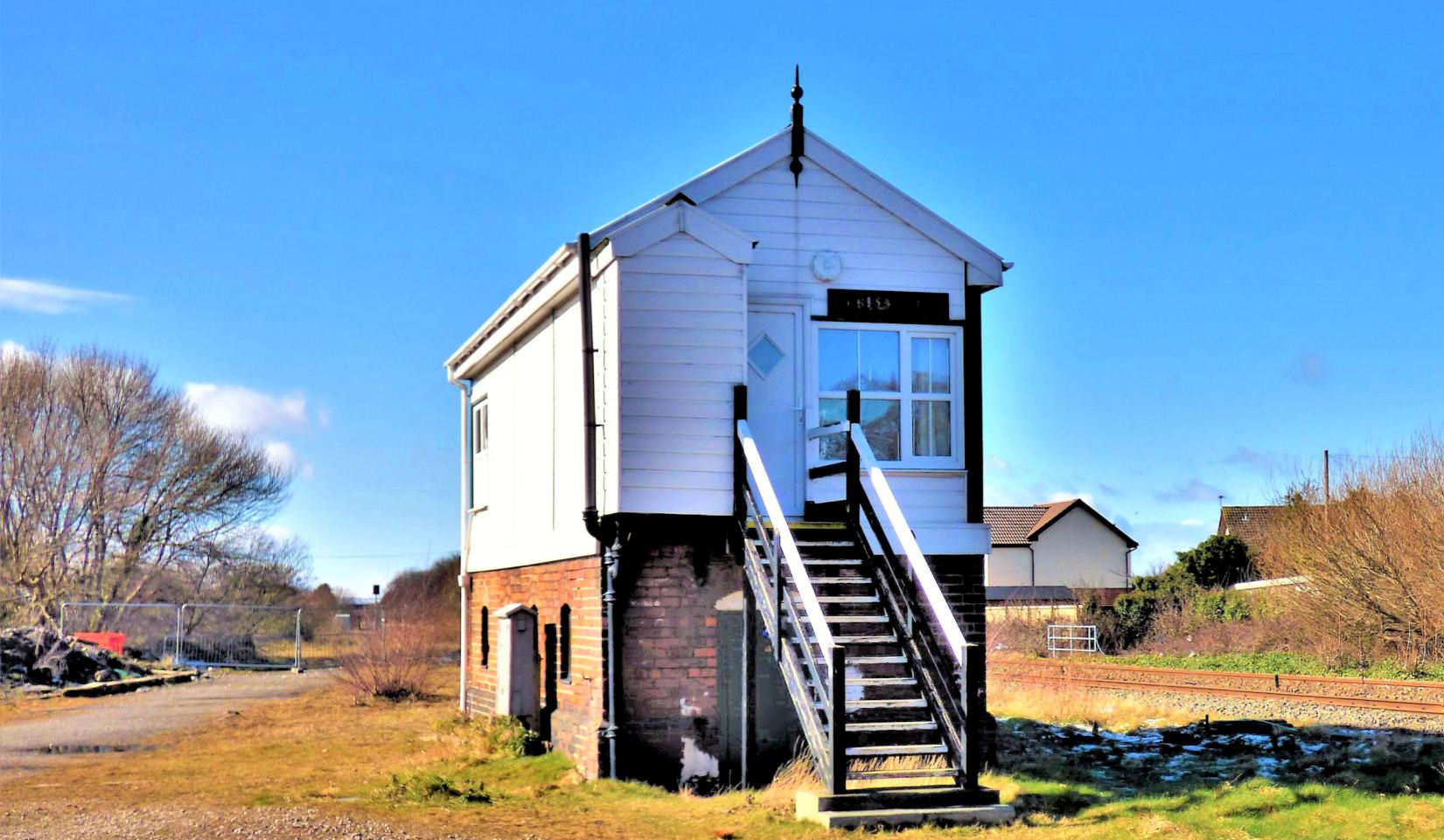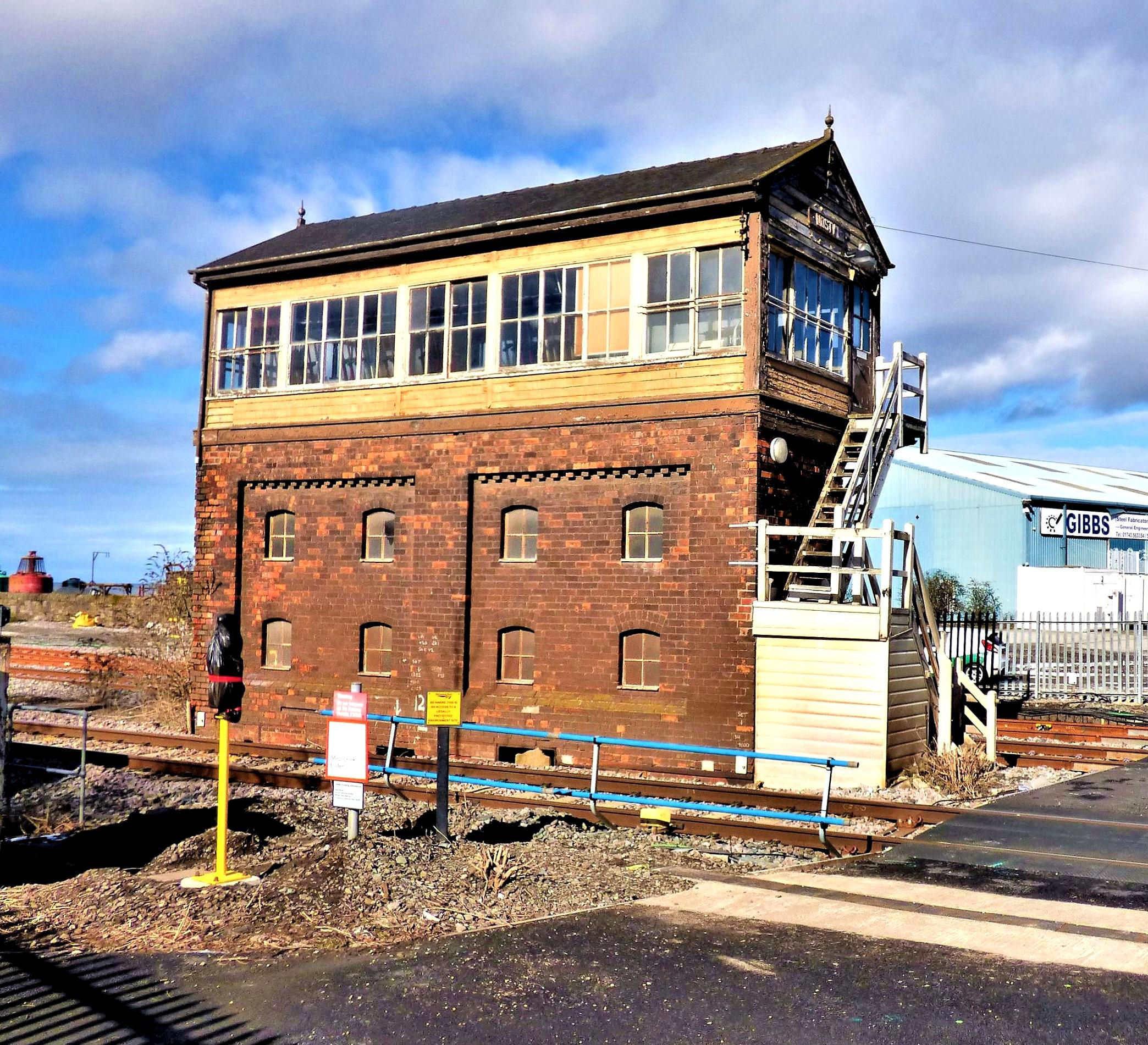 The closed Grade II listed Mostyn Signal Box, the former level crossing (right) is now a NR access point, the new bidirectional Up Mostyn Goods Loop (replacing the Up and Down Loops at Holywell Junction) is the track furthest from the camera. Note the buoy lower centre far left.