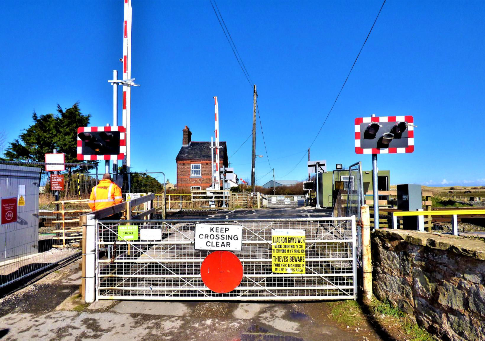 Next door was the original crossing-keeper's house, with an old semaphore signal arm in the garden. Unlike many crossings converted to Manually Controlled Barrier with Obstruction Detection, here CCTV cameras were being installed so that the crossing could be operated remotely from the W-ROC.