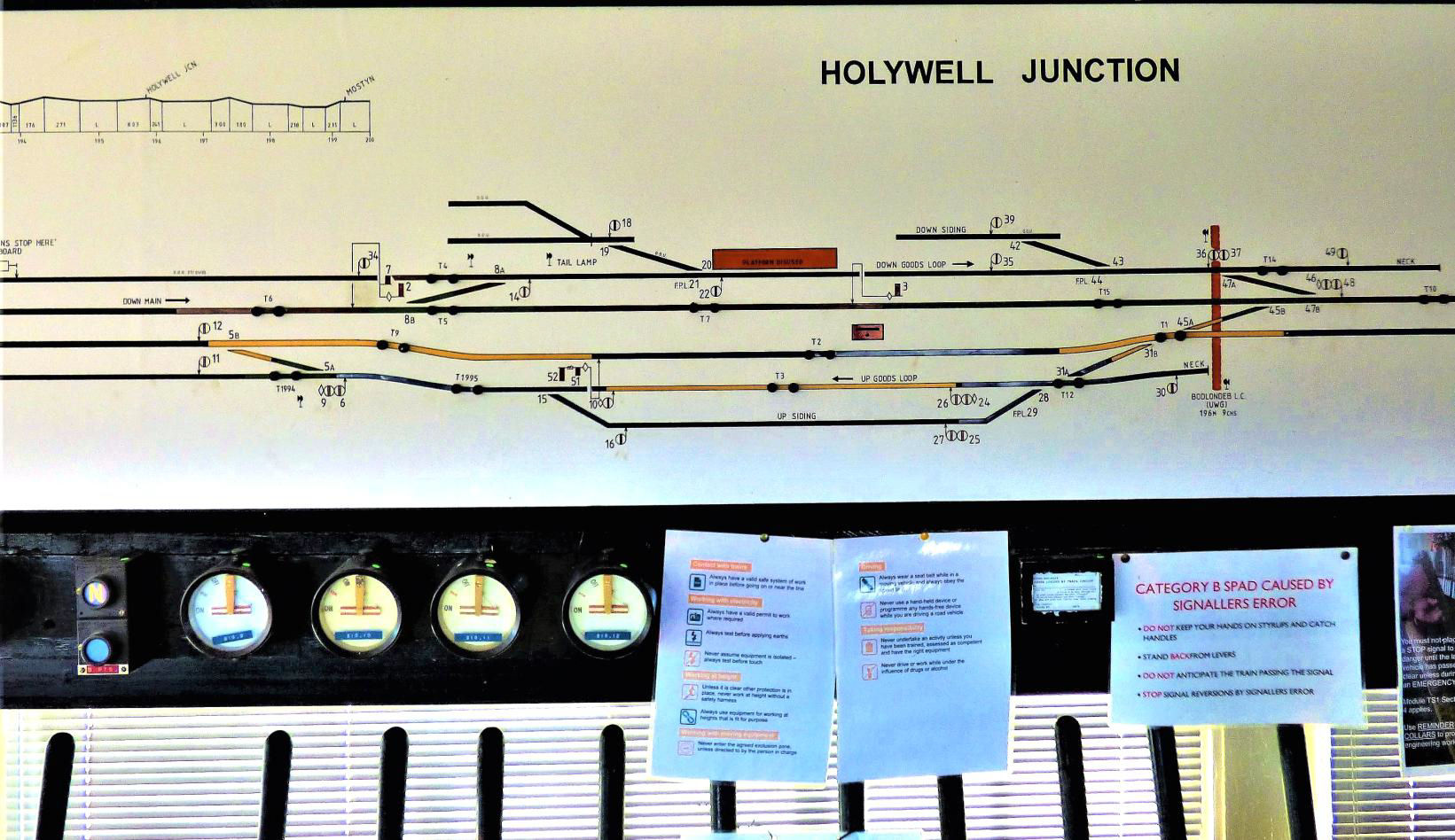 Abergele Signal Box instruments, the green dots indicate equipment to be saved for possible future use/spares
