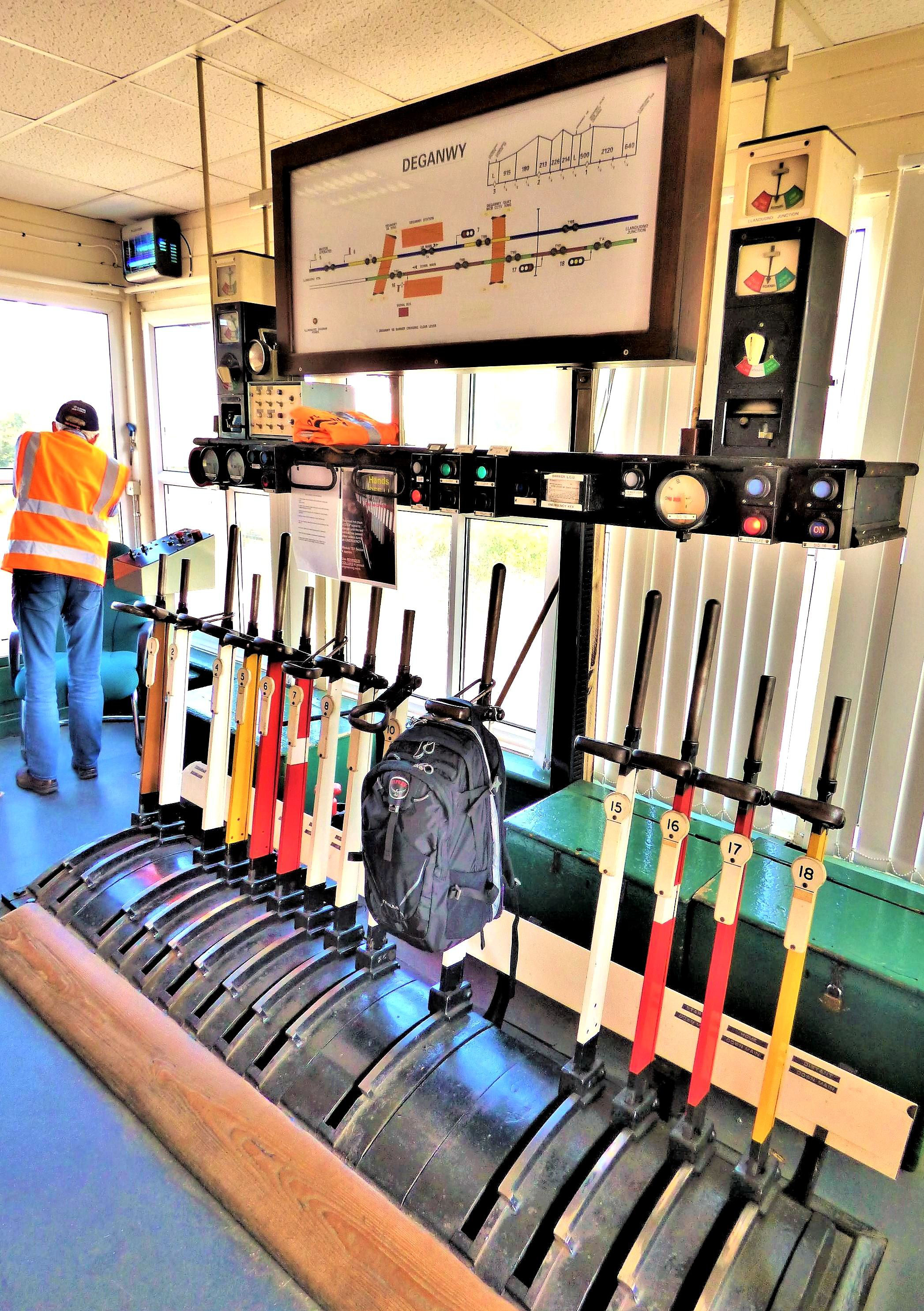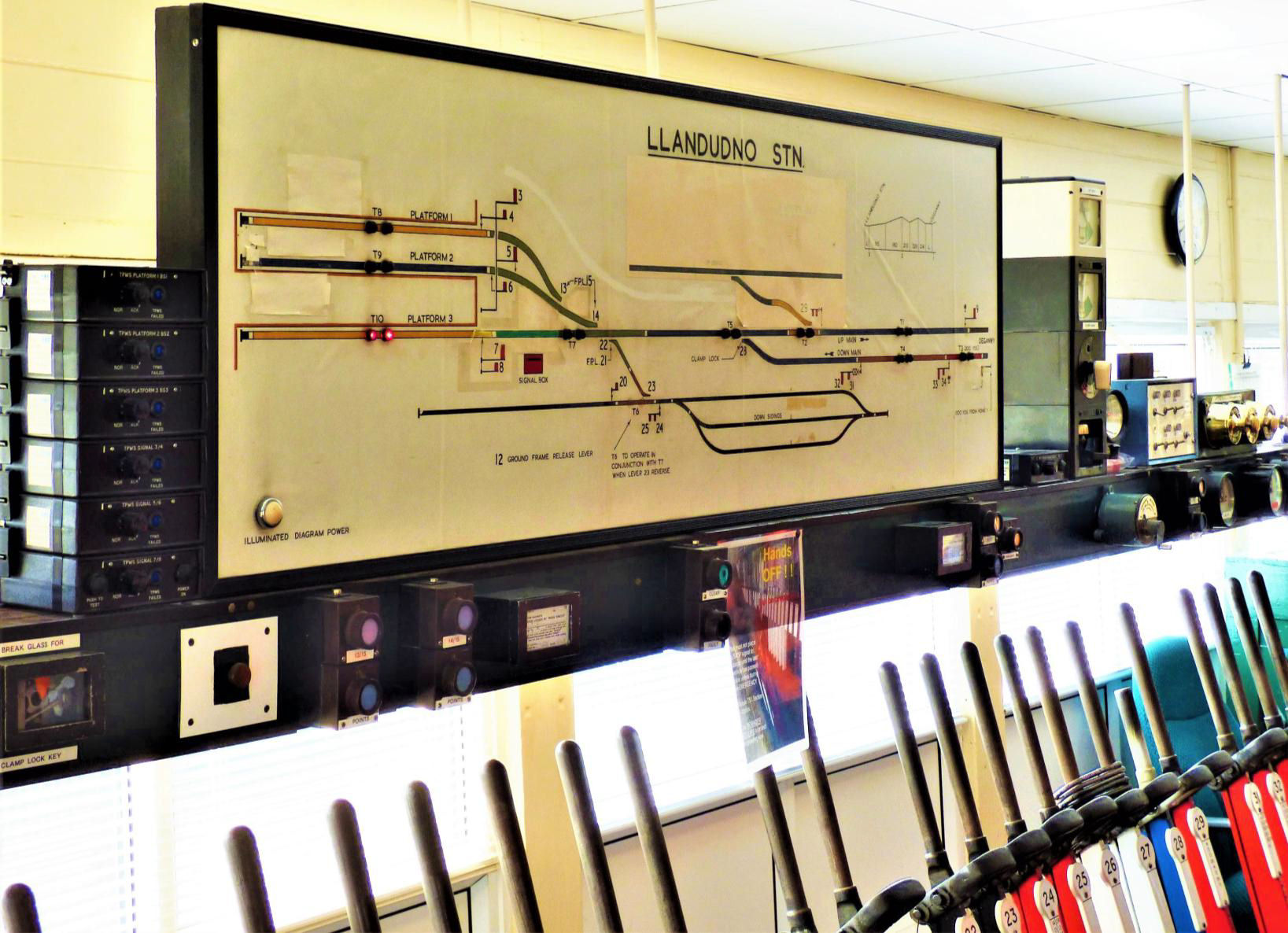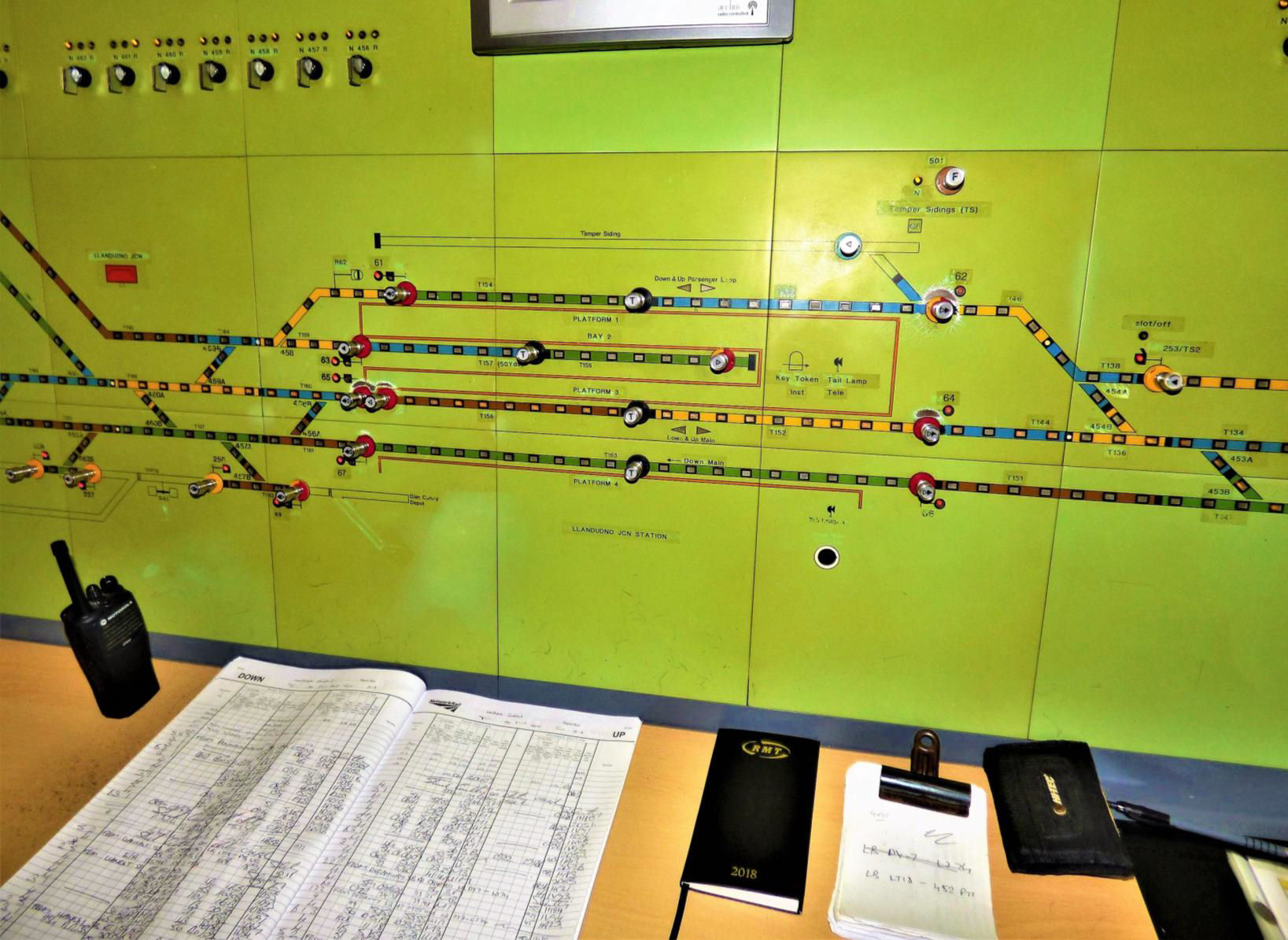 On the west end of the panel is a 'Complete With Tail Lamp' button for the Up Main, pressed for each Up service to confirm it is complete with tail lamp and out of section. There used to be one for the Down Main from Colwyn Bay but it was removed when Cardiff ROC took that over. [They would need exceptional eyesight!] Bi-directional signalling is available on the Up Line between Junction station and Conwy, originally installed for a prospective Conwy shuttle service that failed to materialise.
