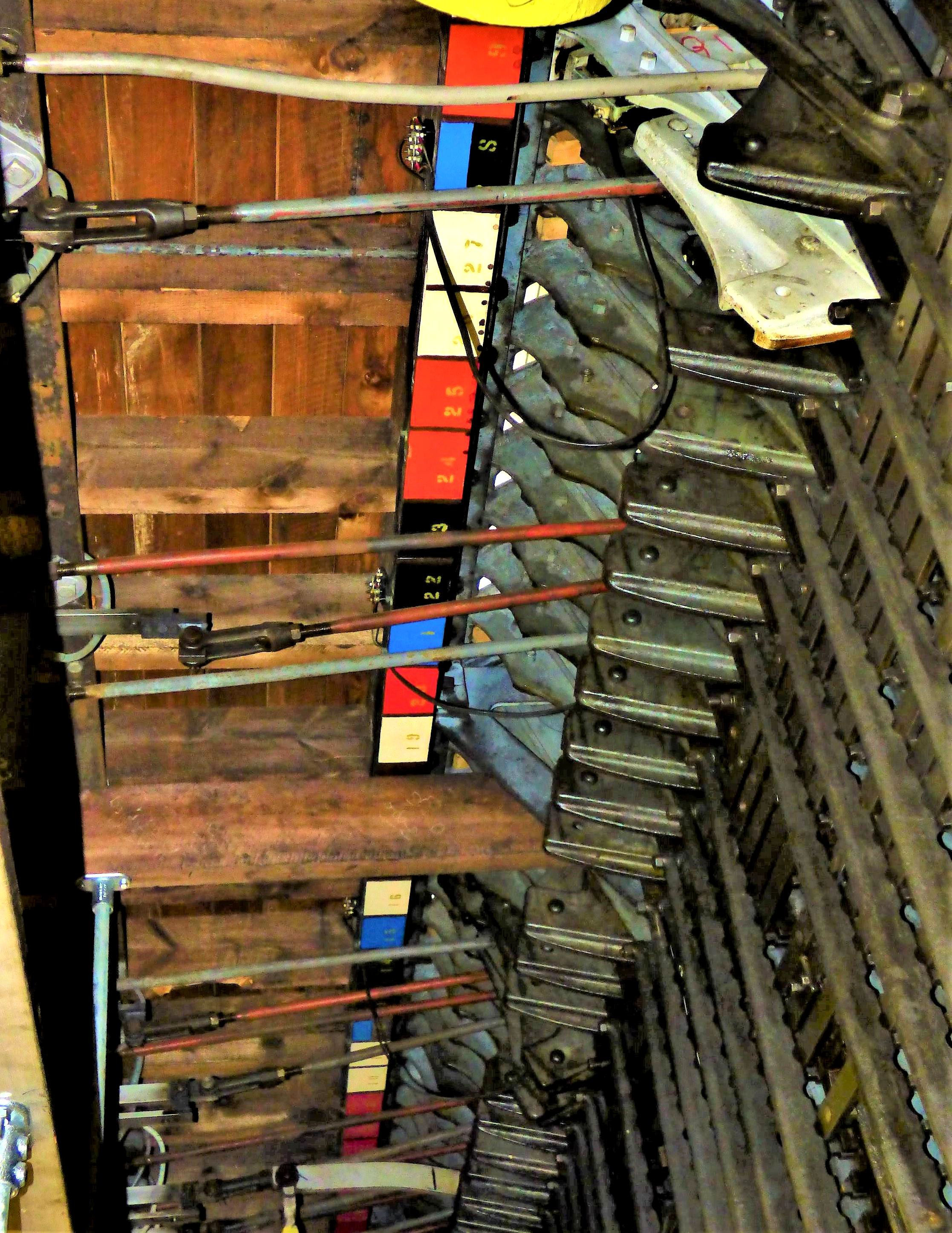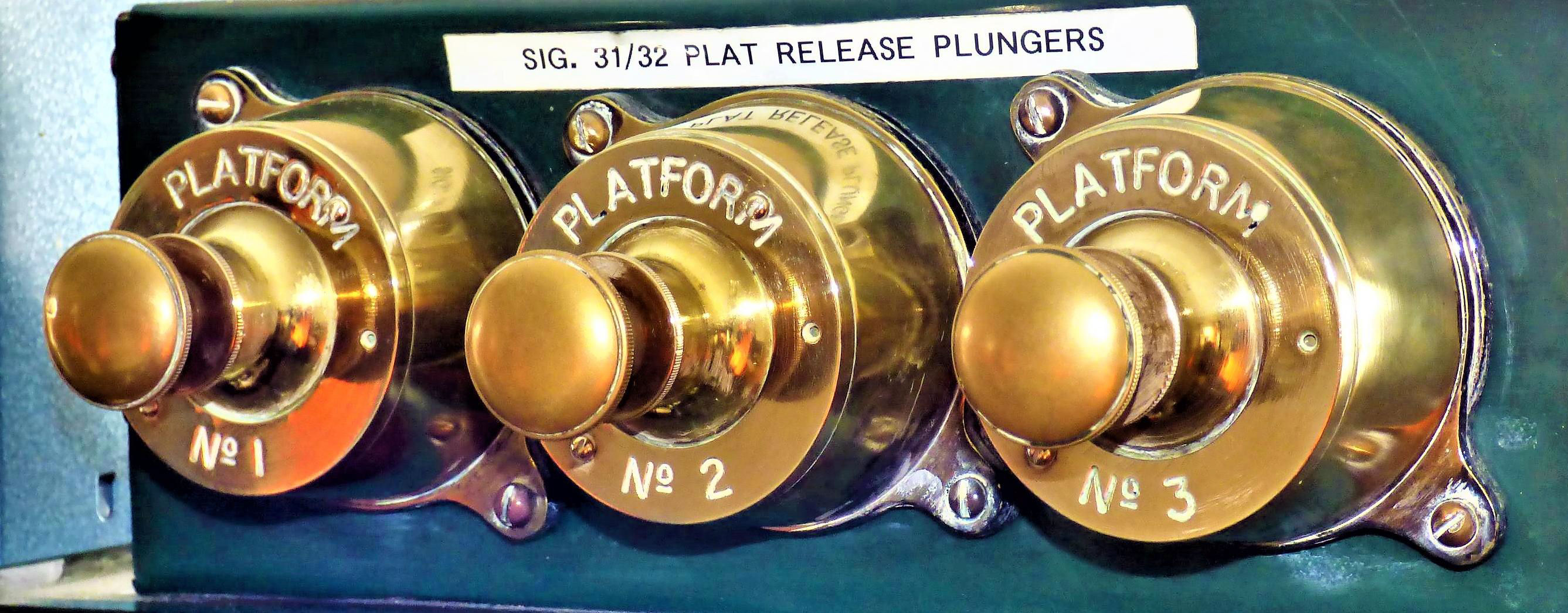 Due to the shortened frame length, the operating floor has been partitioned into two distinct areas; the one closest to the station has the frame etc, while the other area is empty. There are three highly polished brass plungers at the high numbered end of the frame for proving the route into the station; the relevant platform plunger is held down while the Inner Home signal lever is pulled. The route indicator at the Home then displays the platform number set to the approaching train. This is done whether the main arm or 'calling-on' arm is cleared. All three Llandudno platforms are permissive for train Classes 1, 2, & 5 (express, local and ECS). Despite the station throat points all being mechanically operated, the actual detection of the points is electrical. Above the out of use No2 lever there is a single stroke bell, not attached to a block instrument. The Signaller told us that this was formerly for communication with station staff who operated the former frame for the crossover between P1 & P2.
