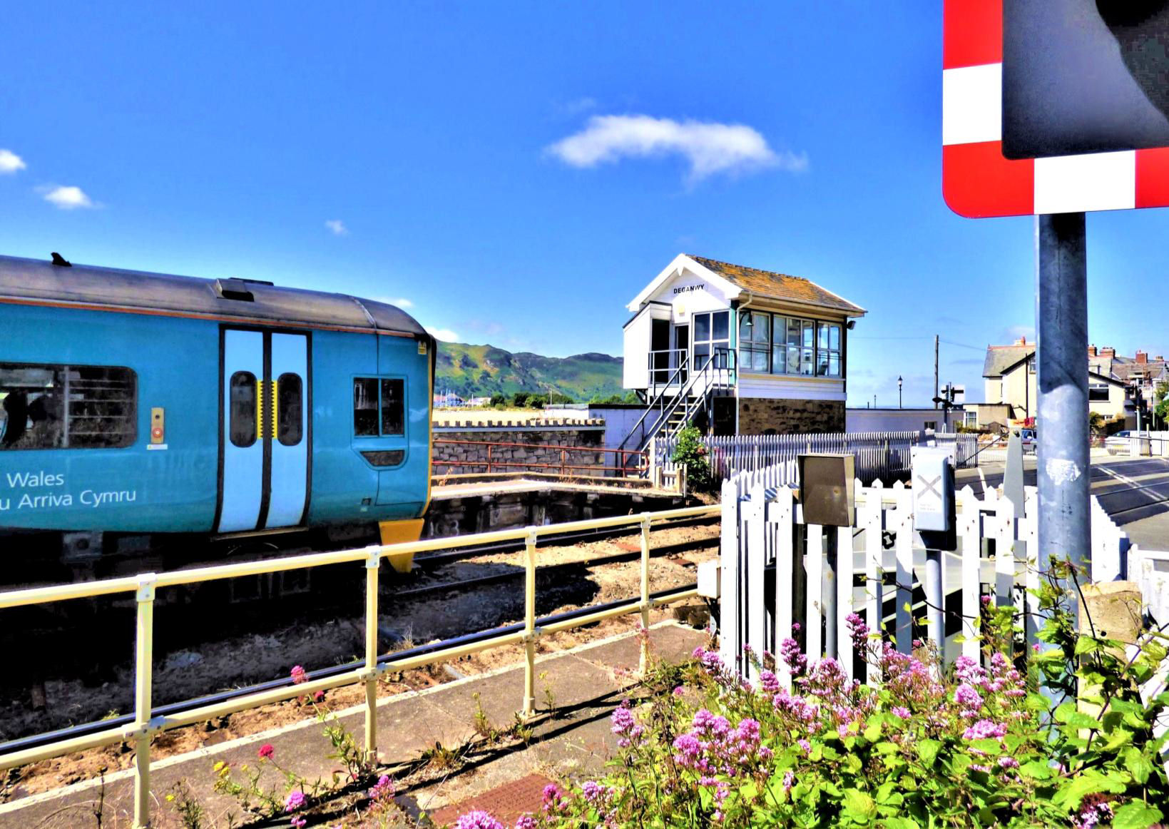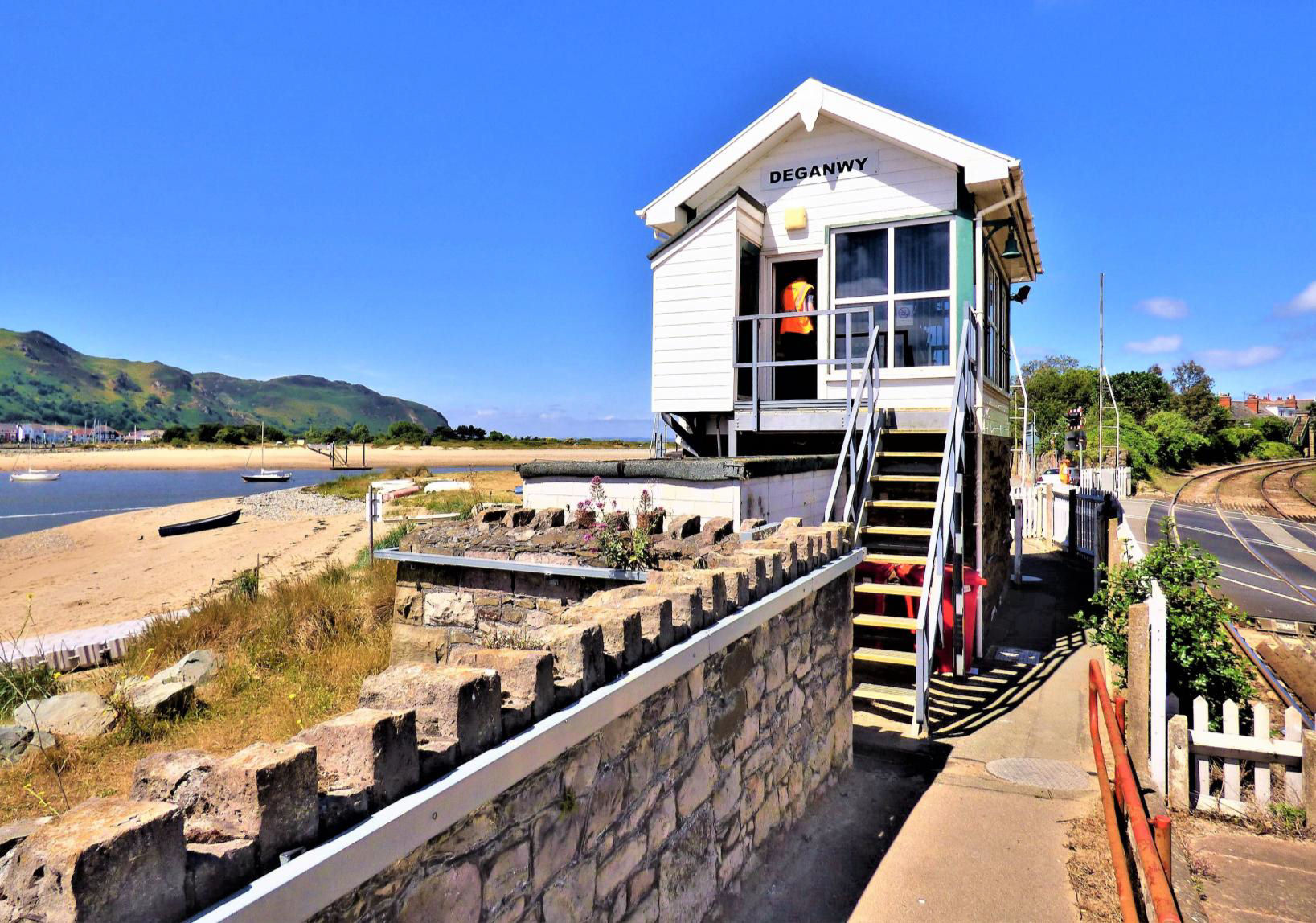 Deganwy Signal Box is on the Down side by the level crossing at the Llandudno end of the station, near the tranquil picturesque harbour. It is an LNWR Type 5 design with a timber top on a stone base, rather than the normal brick base, dating from 1914 with a 1914 dated 18 lever frame. With four spaces and seven white (spare) levers, only seven are in use. No1 is the level crossing release. No5 operates Deganwy's Up Distant signal, a motor operated semaphore. No7 Up Starter also acts as the Llandudno Junction Up Distant - it is a 3-aspect colour light. As well as the station level crossing, the box also controls Deganwy Quay CCTV crossing at the Llandudno Junction end of the station, now only accessing some residential property. No12 (now spare) used to release Deganwy Quay Ground Frame.
