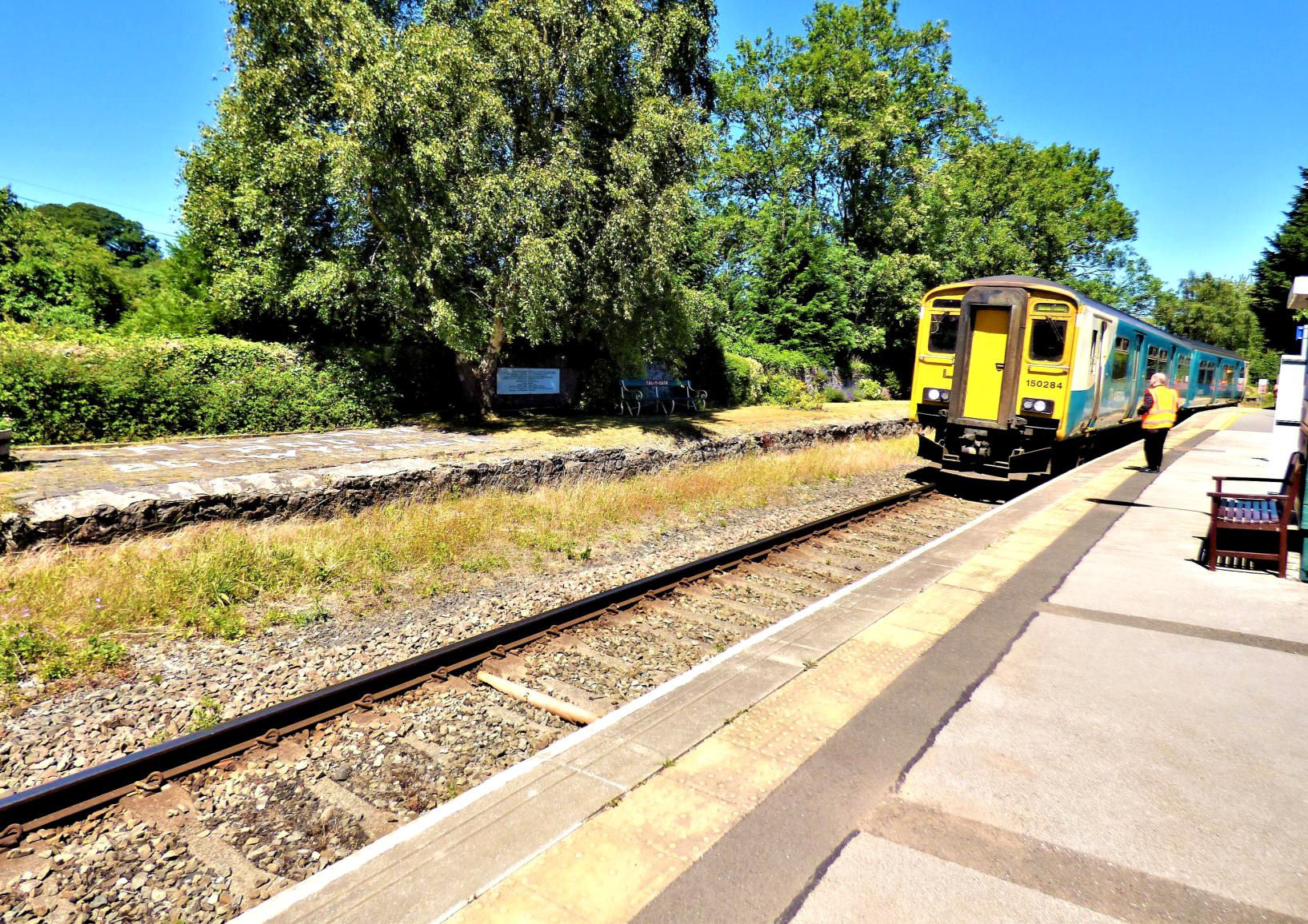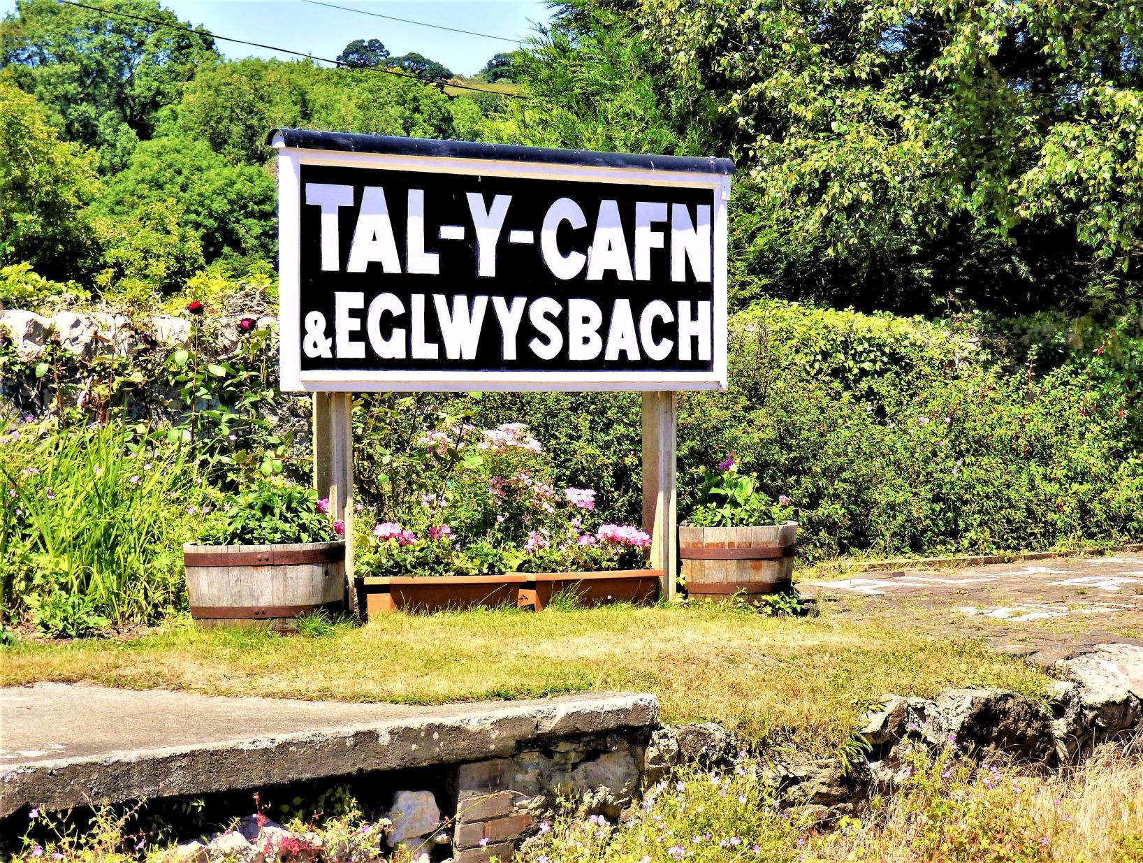 Tal-Y-Cafn: The unstaffed platform has a set of metal gates for the minor road crossing the single line. The former Up platform has a 'TAL-Y-CAFN & EGLWYSBACH' reproduction running-in board. The Crossing Keeper's accommodation is part of the former station house and has photographs showing there used to be signals. They were operated from a small frame in the covered passenger waiting area (still with a public telephone - the mobile reception can't be too good in those parts, but branch trains have very good WiFi!). Now the Keeper just has a set of flags to signal each train.