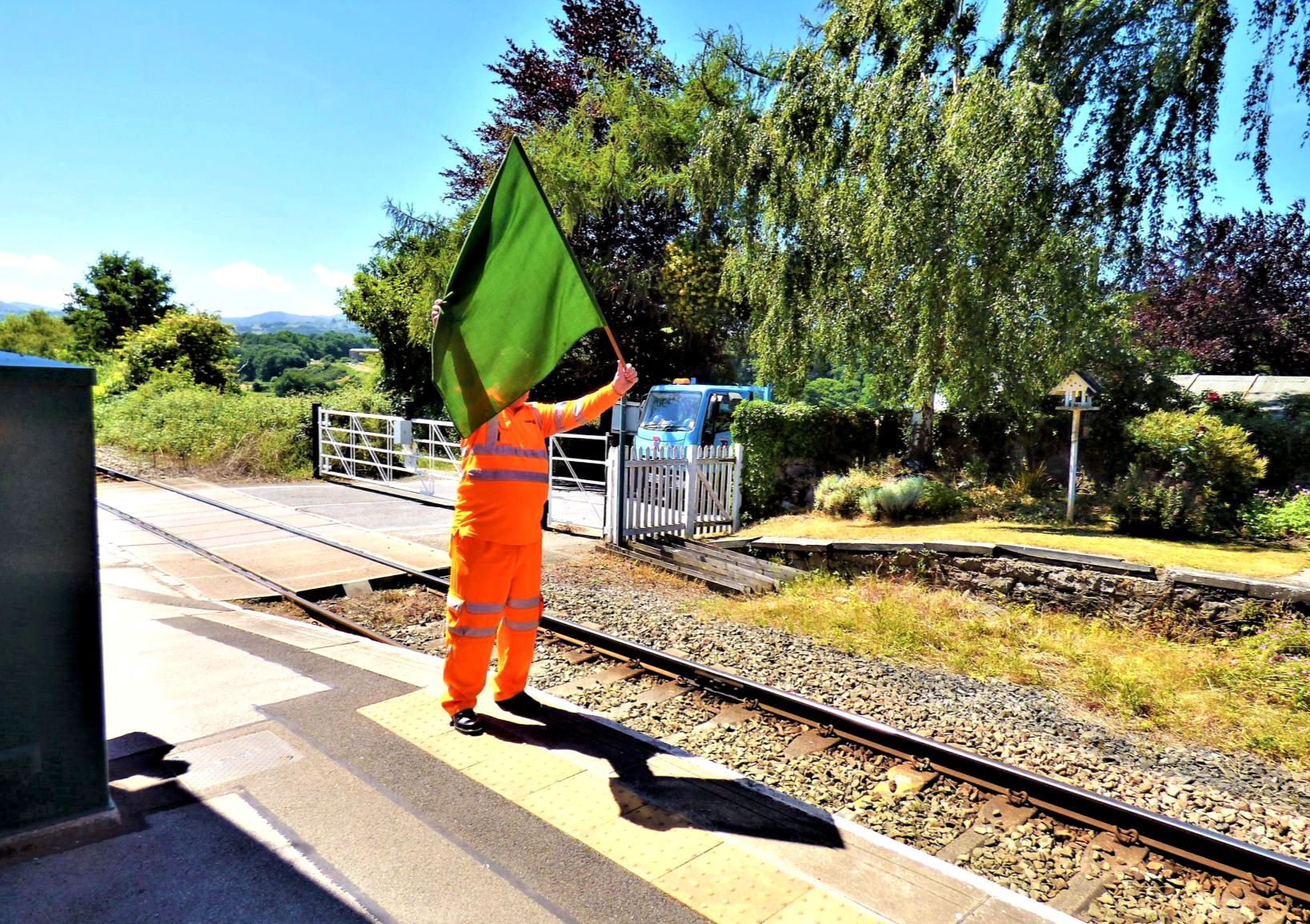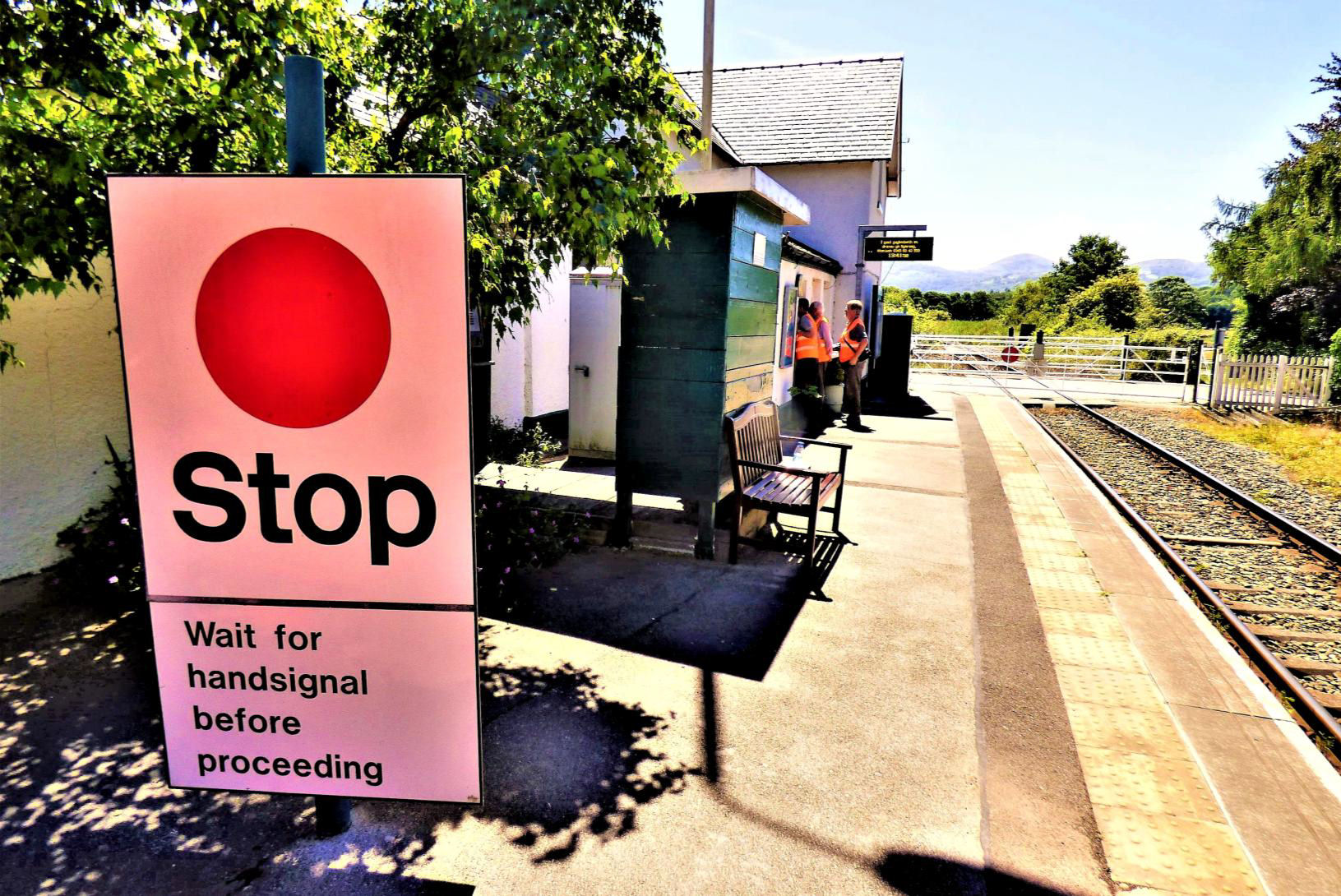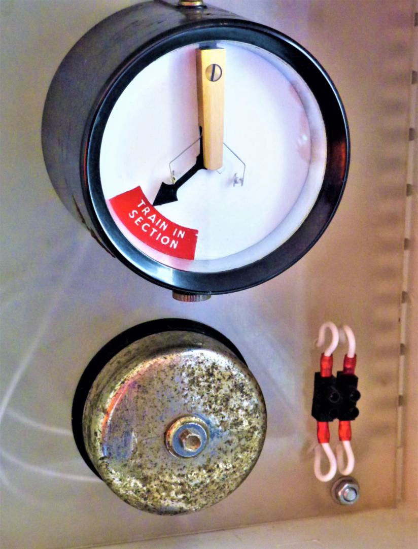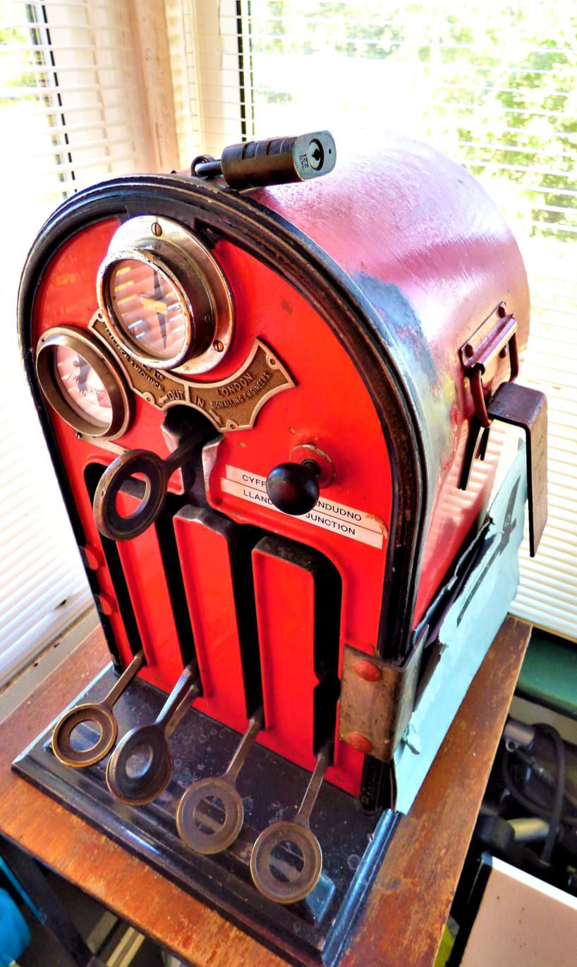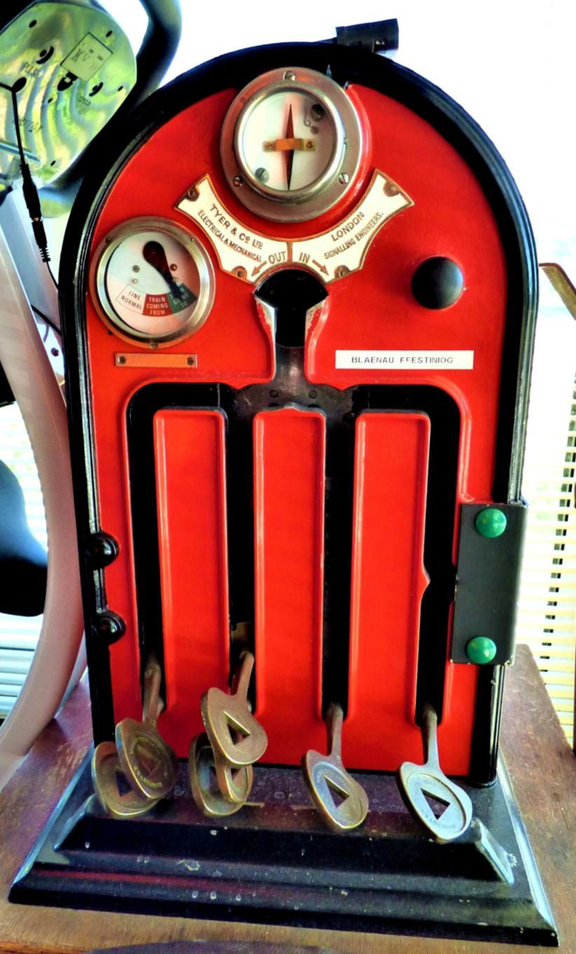 The Crossing Keeper's accommodation has a repeater that indicates when a token has been removed, but does not show from which end of the single line. The keeper needs to remember the direction of the last train to know when to open the gates, although there can still be additional workings, such as a recent weed spray train. The system is safe as trains cannot proceed without the keeper giving the appropriate flag. There is a second repeater on the platform (attached to a location cabinet), although the face of this repeater has long since faded from exposure to North Wales sunlight.