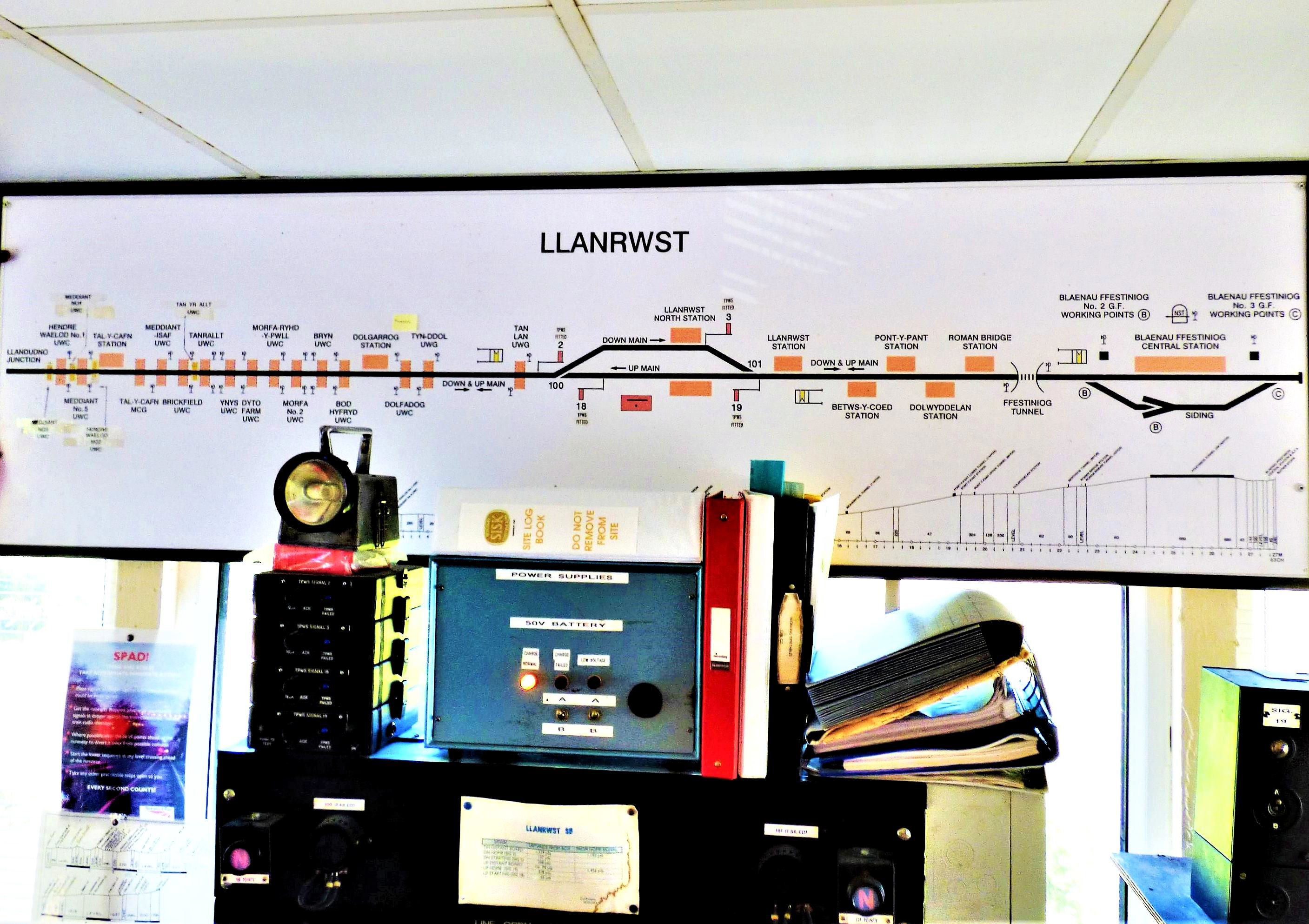 There are no track circuits for the station area which means that, when crossing trains the Signaller needs to observe which one arrives first, to clear the correct Home signal into the loop and avoid delaying the first arrival. The first has to be stationary before the signal is cleared for the second in case the first overruns - an example of a 'non-dynamic' loop. However, crossing only happens when additional trains are running and is not required for the normal service. There are two Tyer's Electric Token Key machines, one for the section from Llandudno Junction (round hole tokens) and the other from Blaenau Ffestiniog (triangular hole tokens). A quaint and uncommon feature was that Llanrwst box still has an outside toilet, a metal one which is an ice box in winter and an oven in summer!