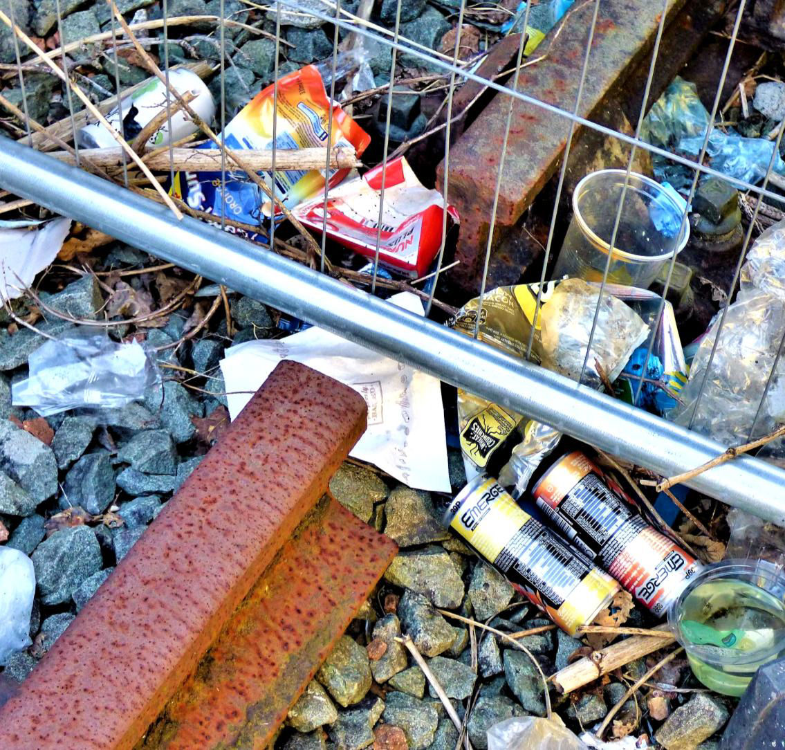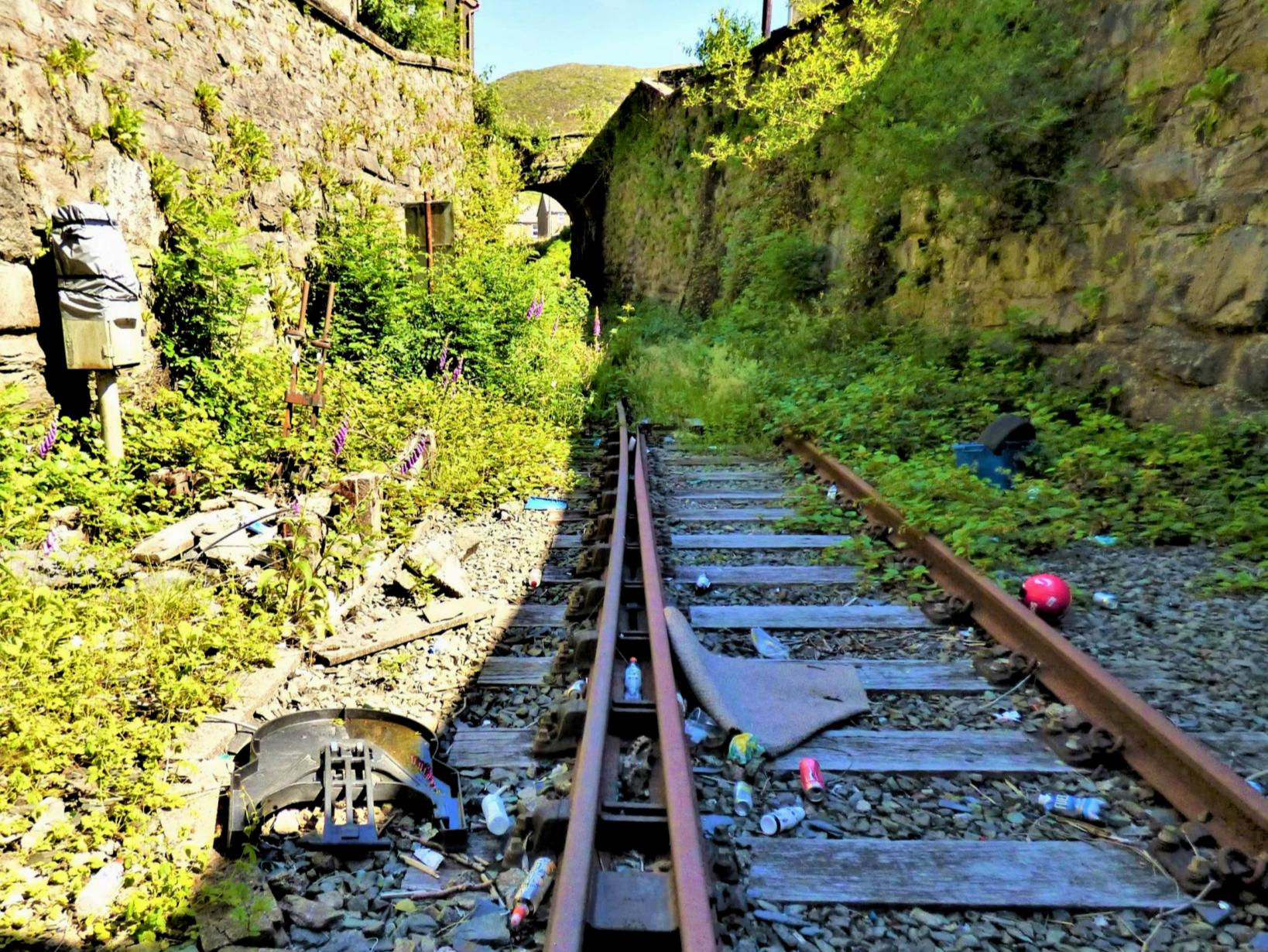 Looking south from Blaenau Ffestiniog station, along the very inviting disused branch to Trawsfynydd, showing the trap point. The two very rusty levers of Blaenau Ffestiniog No4 Ground Frame that controlled it poke out of the vegetation middle left.