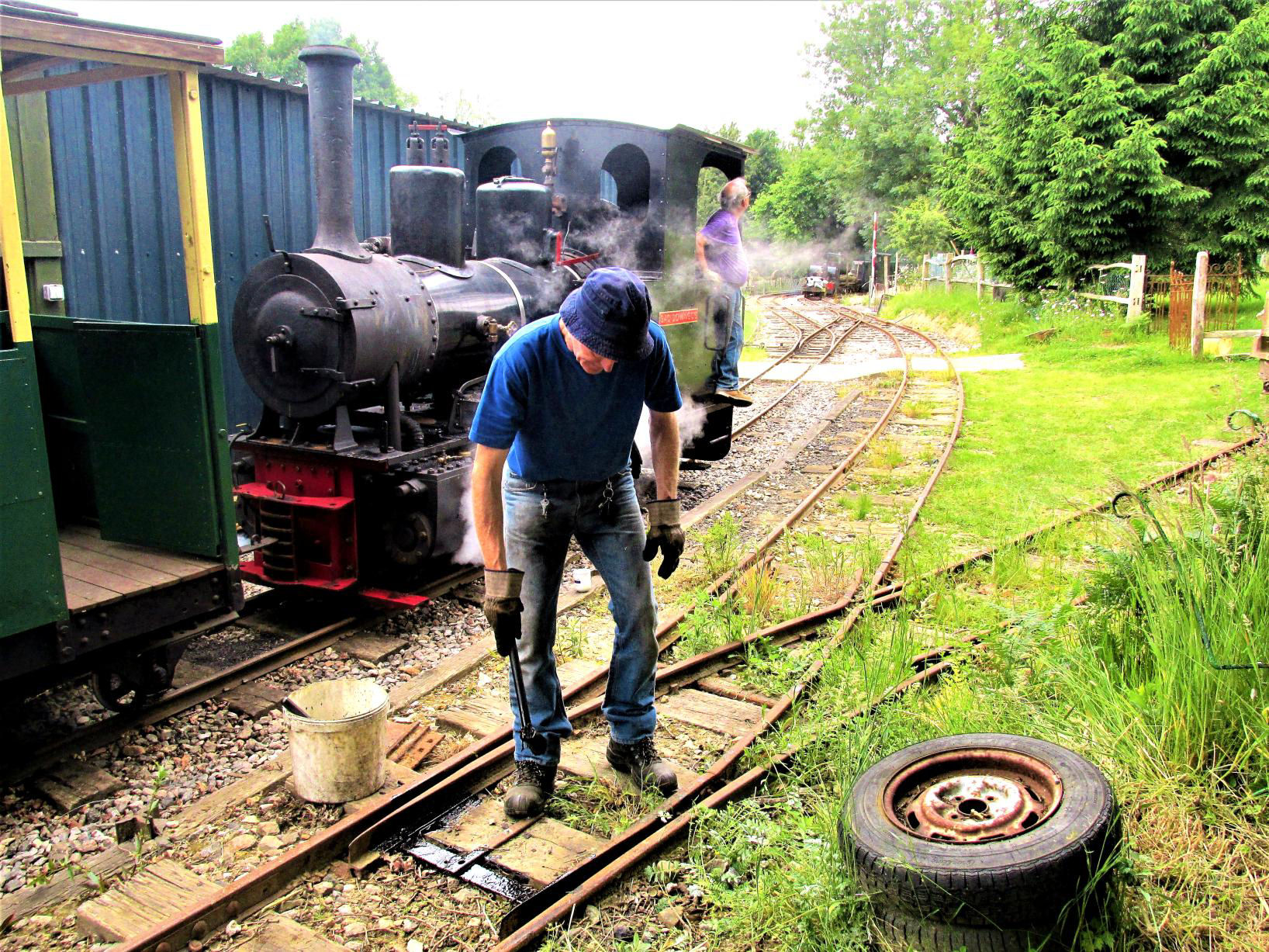 A railway volunteer 'Tinkers' with a rarely used point prior to our trip to test it (successfully). The steam loco simmers in the background on the main line awaiting its turn on the railtour.
