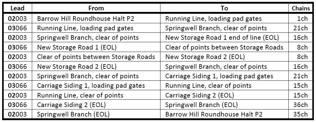 That wasn't the only bad news though, as the planned haulage by 08879 was thwarted by last minute electrical/ battery problems. This meant that a short PLEG haulage event planned for earlier that evening had to be cancelled. Our track event went ahead though with the 08 replaced by 03066 operating in top & tail mode with 02003 as planned. These locos at either end of three very smartly turned out brake vans B954215, B953231 & B730687 were sat in the Roundhouse Halt P2 awaiting our arrival. Participants were provided via email with an updated track plan (thanks to Martyn Brailsford) and a stock list (thanks to Gary Lonsdale), and also on the day with a souvenir ticket - seen earlier above (thanks to Jim Sellens - and, of course all the others featured in these reports) on the evening of the event. After boarding, 03066 led out of the platform and the following moves took place, a total of 2m 32ch, half with each loco ('chainages' thanks to Graham Parkin & Jim Sellens)…