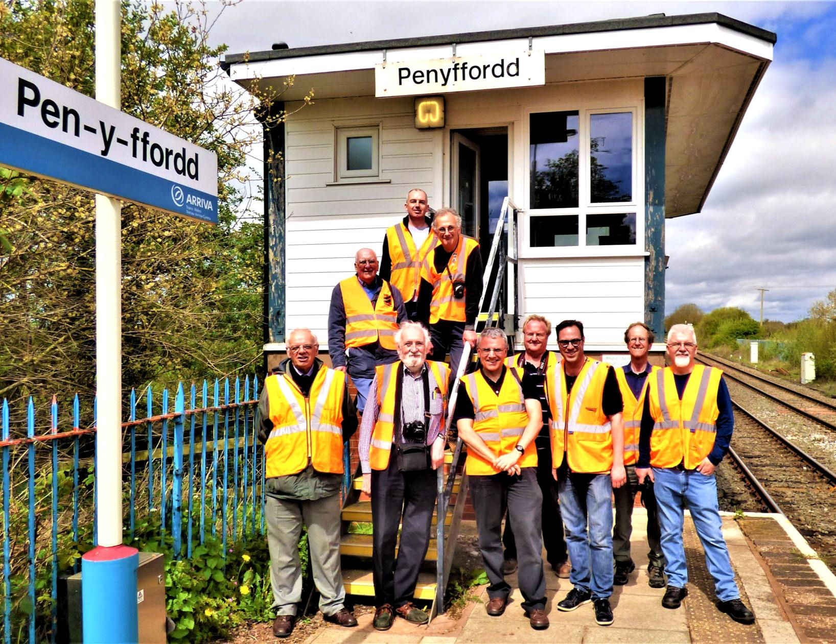A fine selection of 'borderline' BLS Members. Top of the stairs is our roving photographer Nick Jones from Fort William with your BLN Wales Regional Editor Chris Parker (left hand on handrail - as good a place as any). Front row second from the left leaning on the handrail is the one and only Angus McDougall and the other side of the handrail is Society electronic message guru Nick Garnham. Third from the right is the fixture organiser Barney Clark with report author Ian Mitchell second from right. Looking north, the link to the Mold/Denbigh line diverged left behind the box.