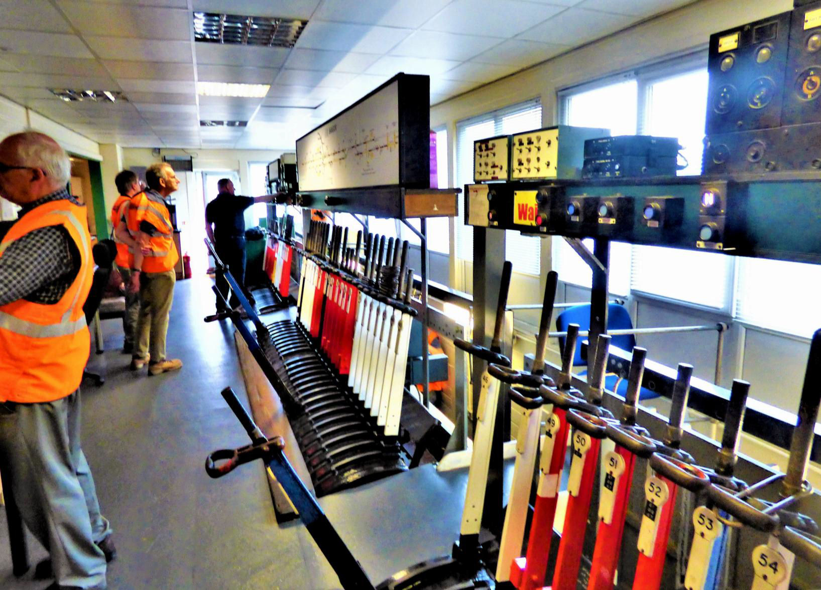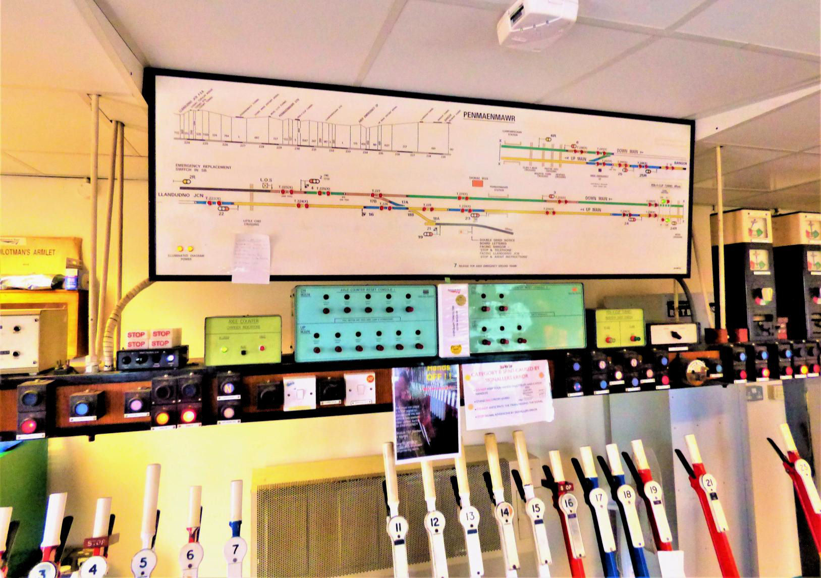 After that we headed to Bangor, where the London and North Western Railway type 5 box, dating from 1923, is at the west end between the station and the tunnel. It was formerly Bangor No2 and has 60 levers (with 20 spare) arranged in three groups. Control extends into Anglesey, including the single line over the Britannia Bridge, the next block post being Gaerwen. Because of the constricted space in the cutting, the locking room is reached by an internal staircase and a relay area occupies what was once part of the operating floor (at the west end).