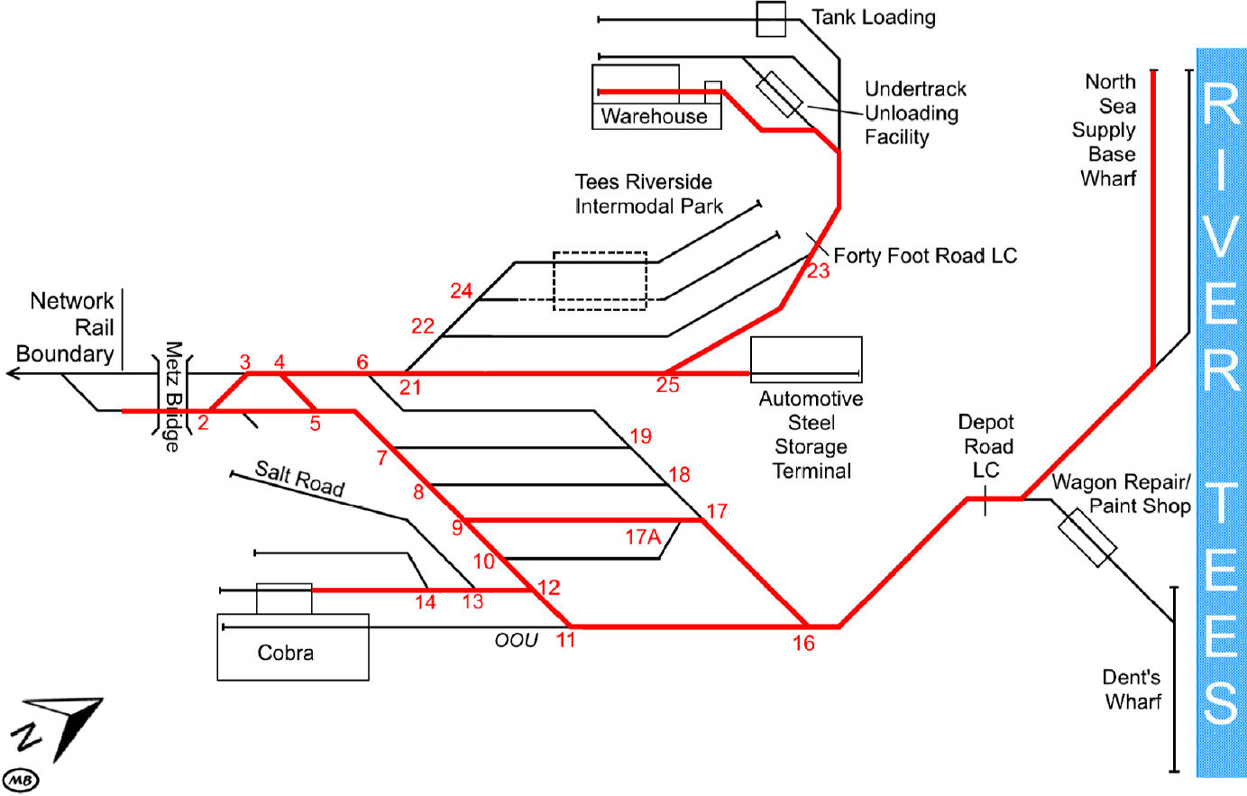 Between Points 11 and 16 along the edge of the yard, coming out of Cobra Terminal before reversing to reach the NR Boundary with the third transporter bridge (Middlesbrough) to feature in this BLN.