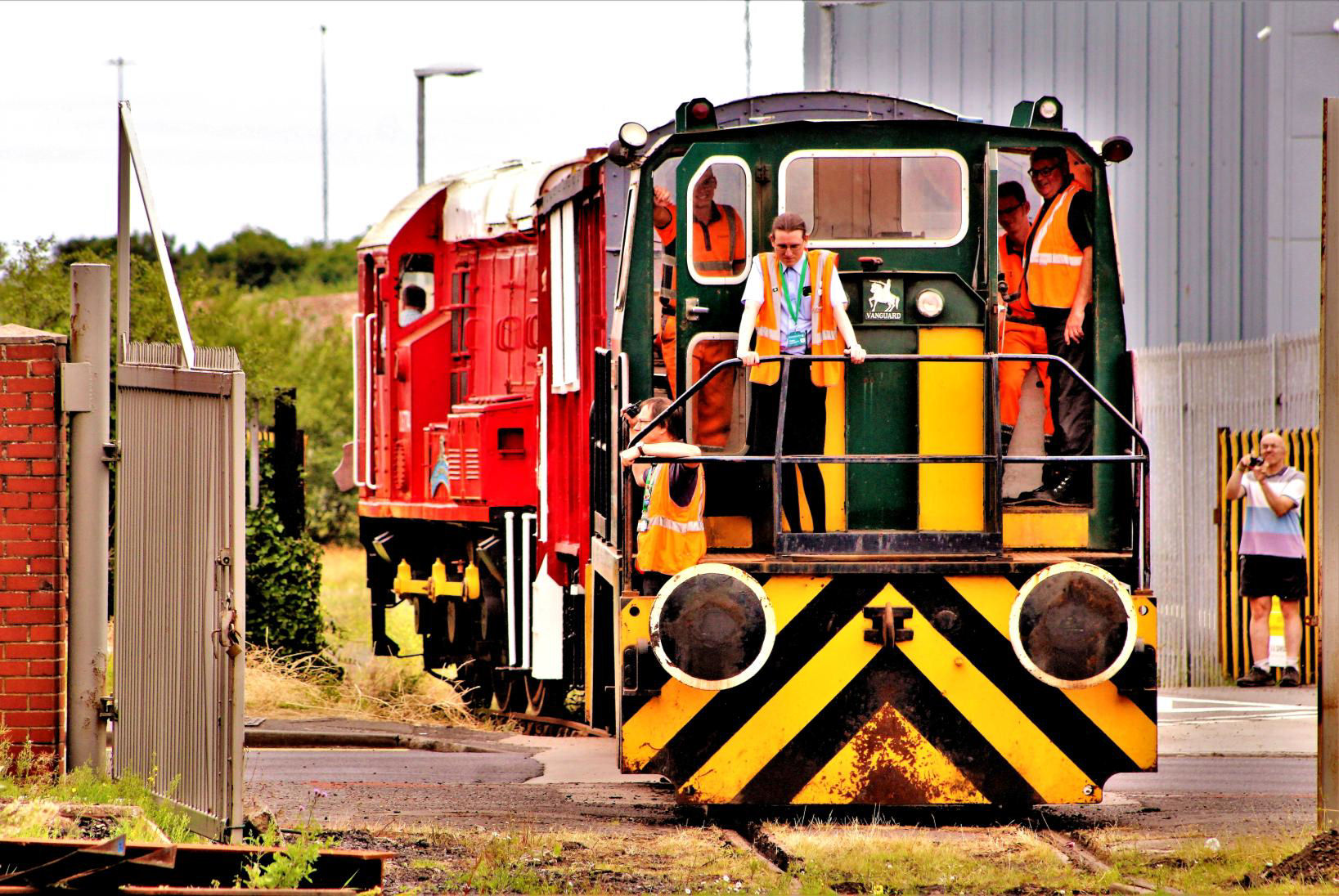 We changed direction once again and when clear of No11 points reversed yet again and travelled on the left hand road beyond the Metz Road overbridge right up to the Network Rail boundary. The final reversal saw us go left at No2 points to just short of the Automotive Steel Storage Terminal ready to form the next tour. Many then took the opportunity to take photographs of the train and locomotives.