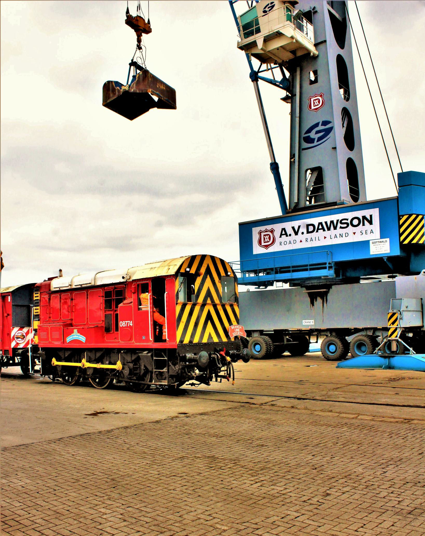 Hold on tight everyone; the crane shunting demonstration is about the begin... at the end of the North Sea Supply Base Wharf, inner track.
