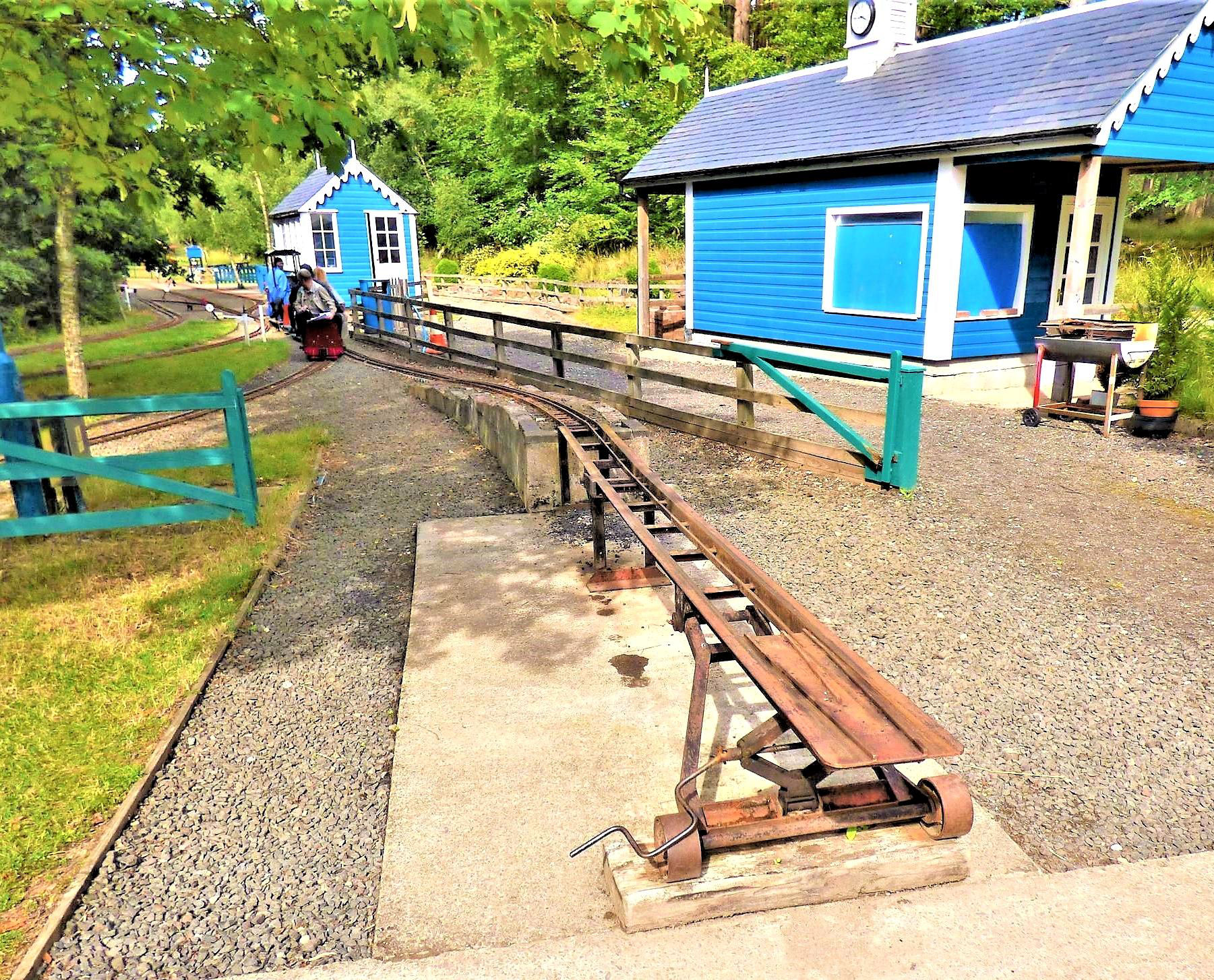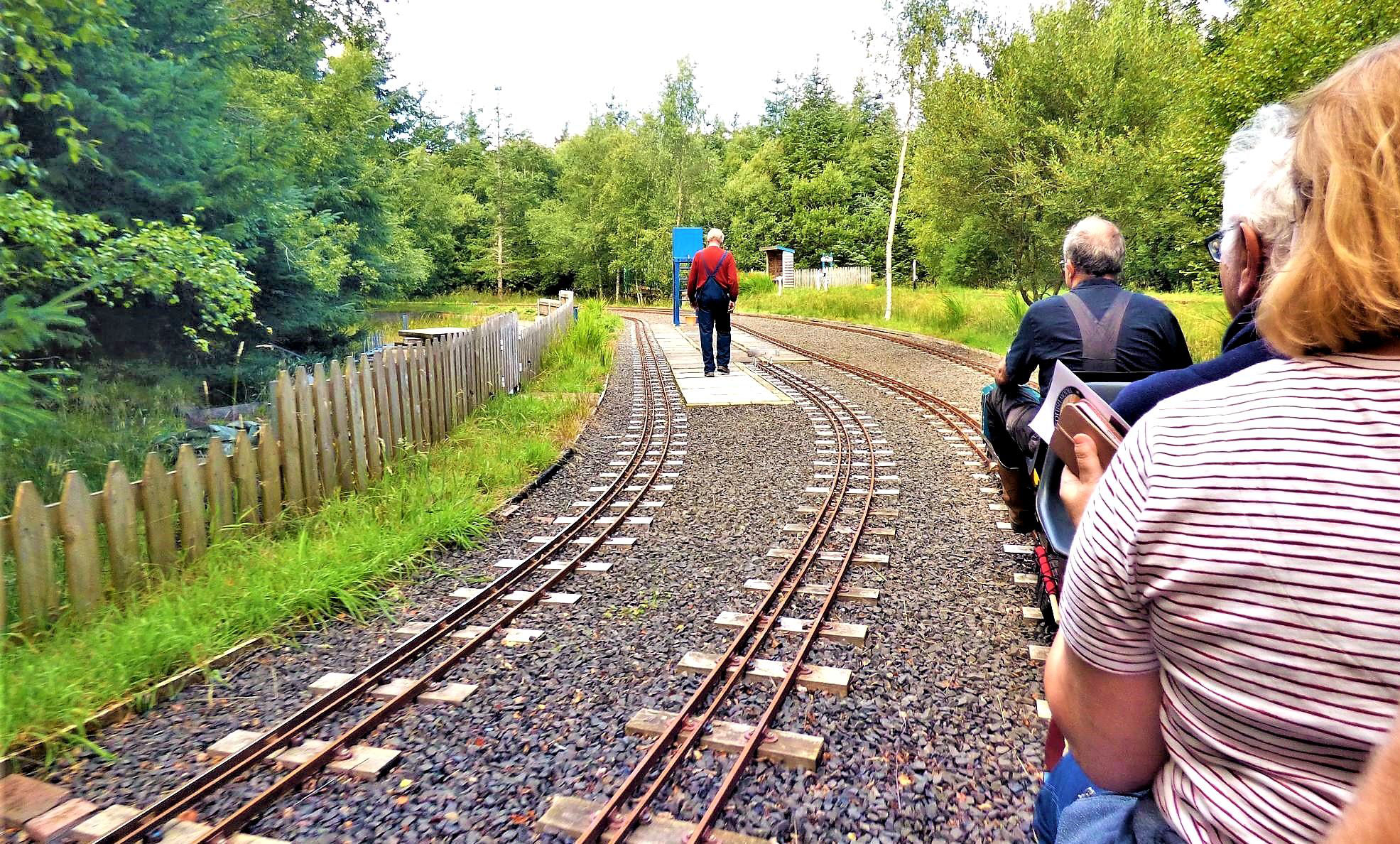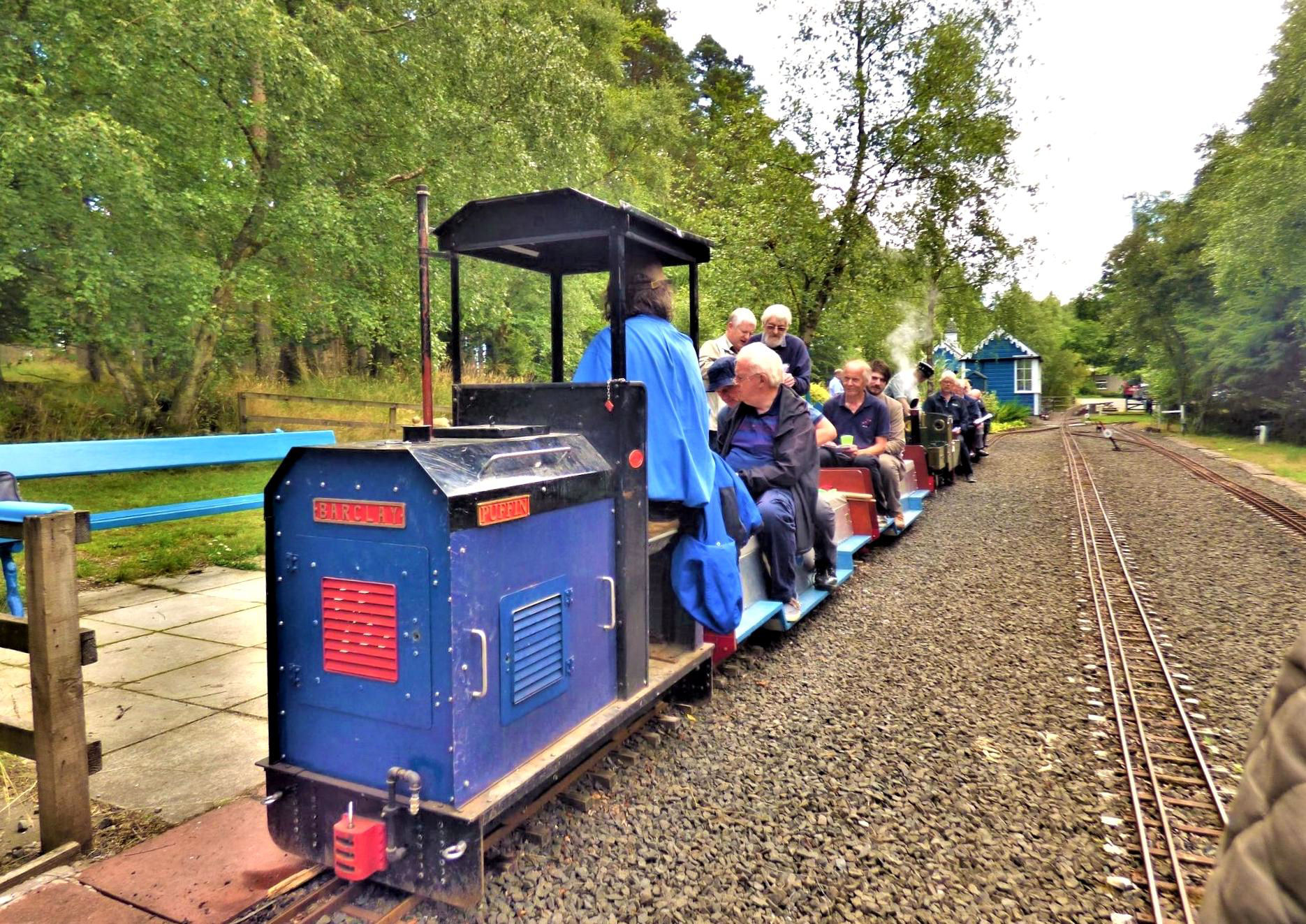 The weather forecast was not promising and the morning brought the usual Scottish dreich¶. Happily, as we arrived the sun burst out and remained for the whole of our visit, a definite plus for an extensive tour in uncovered sit-astride stock. Refreshments were provided in the well appointed club room and, once all had arrived from far and wide, we moved to the railway's main station, Pickston. Our party of 18 (an impressive collection of miniature men and women) divided into three trainloads which the layout could easily take simultaneously. One steam hauled by WPR No3 0-4-0 'Auld Reekie', one pulled by replica Barclay industrial shunter 'Puffin' and our train was hauled by BR Class 20 replica '20020'.