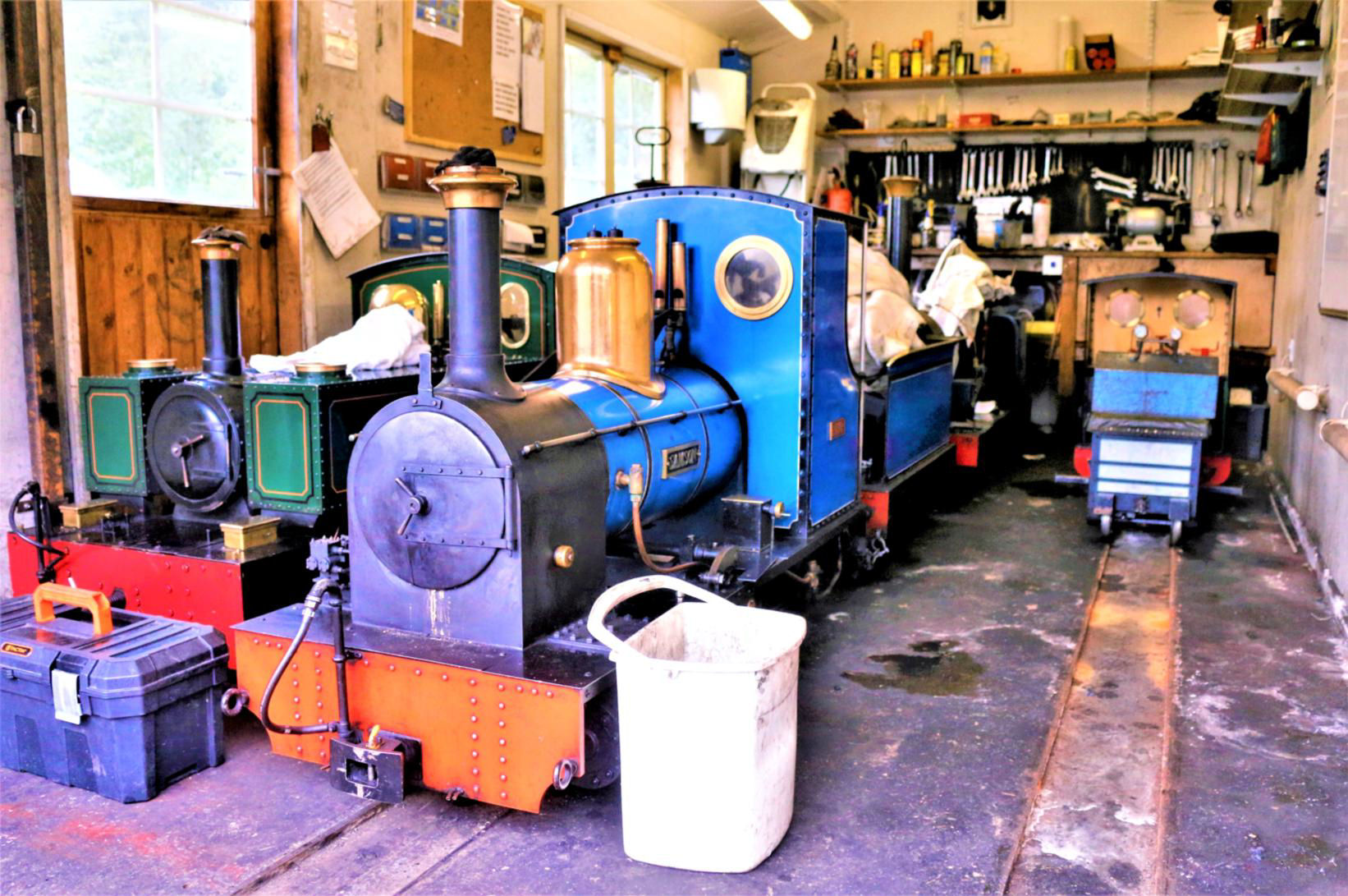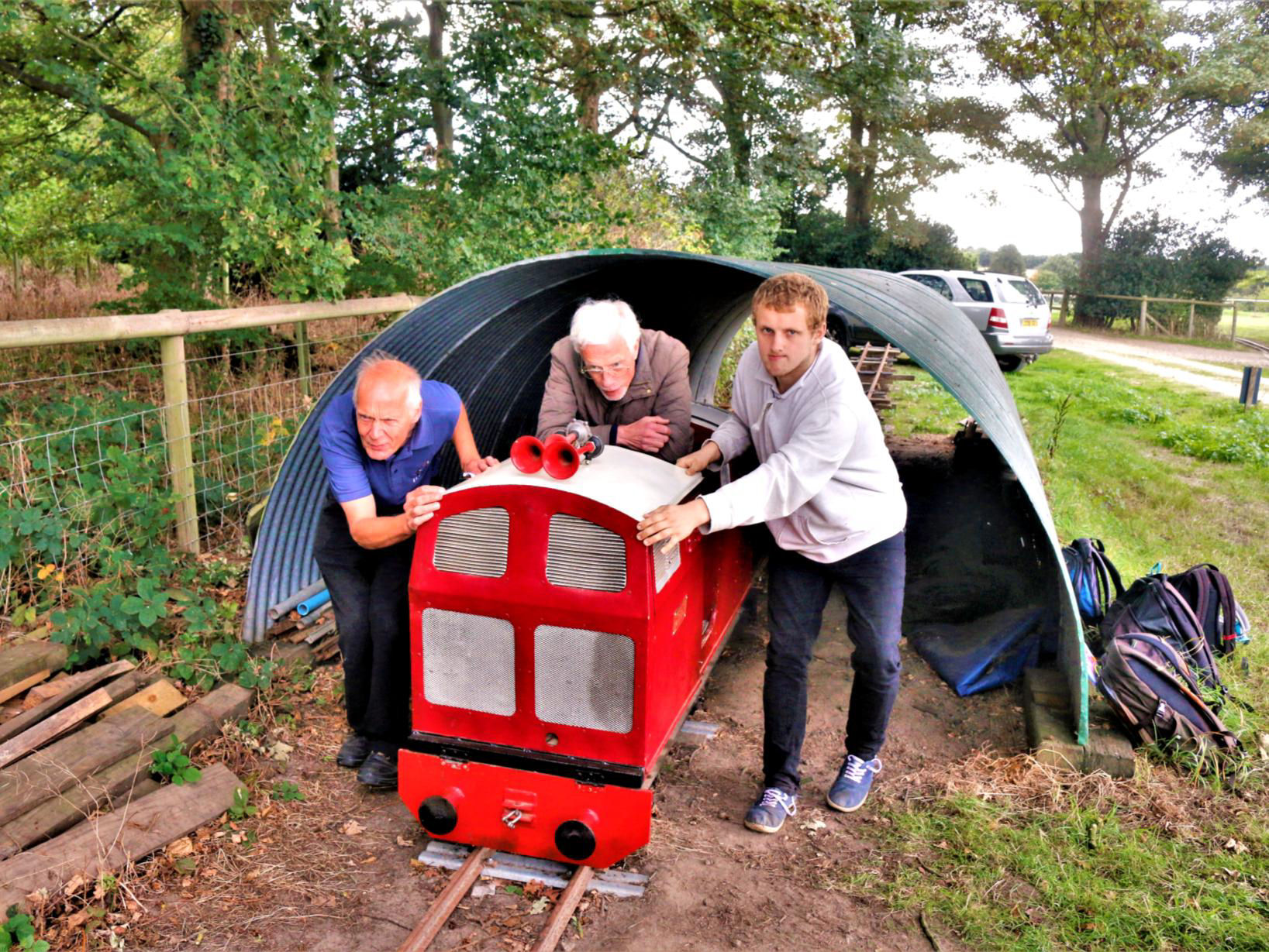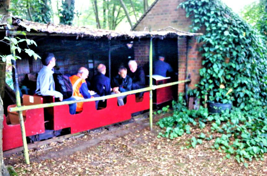 https://goo.gl/zGSZ3Q based here; it is red. The others present are 'Meteor IV' (bright green), 'V' (darker green) and 'IX' (bright yellow). In your reporter's opinion, they look rather odd and angular, rather like Class 74s for those old enough to remember these, not me, I hasten to add! The Woodland Area has quite a sharp steeply graded curve and our loco initially struggled but made it on the second attempt. Pulling up alongside the very long overgrown loco and carriage shed, deep in the woods, we stopped for the other three locos to be removed from the shed, stabled for inspection/photos and then moved clear so our entire train could be hauled to the end of the shed. It was pitch black inside and our BLN Editor could be heard commenting that it would make a great Ghost Train for kids/adults - cobwebs and all!