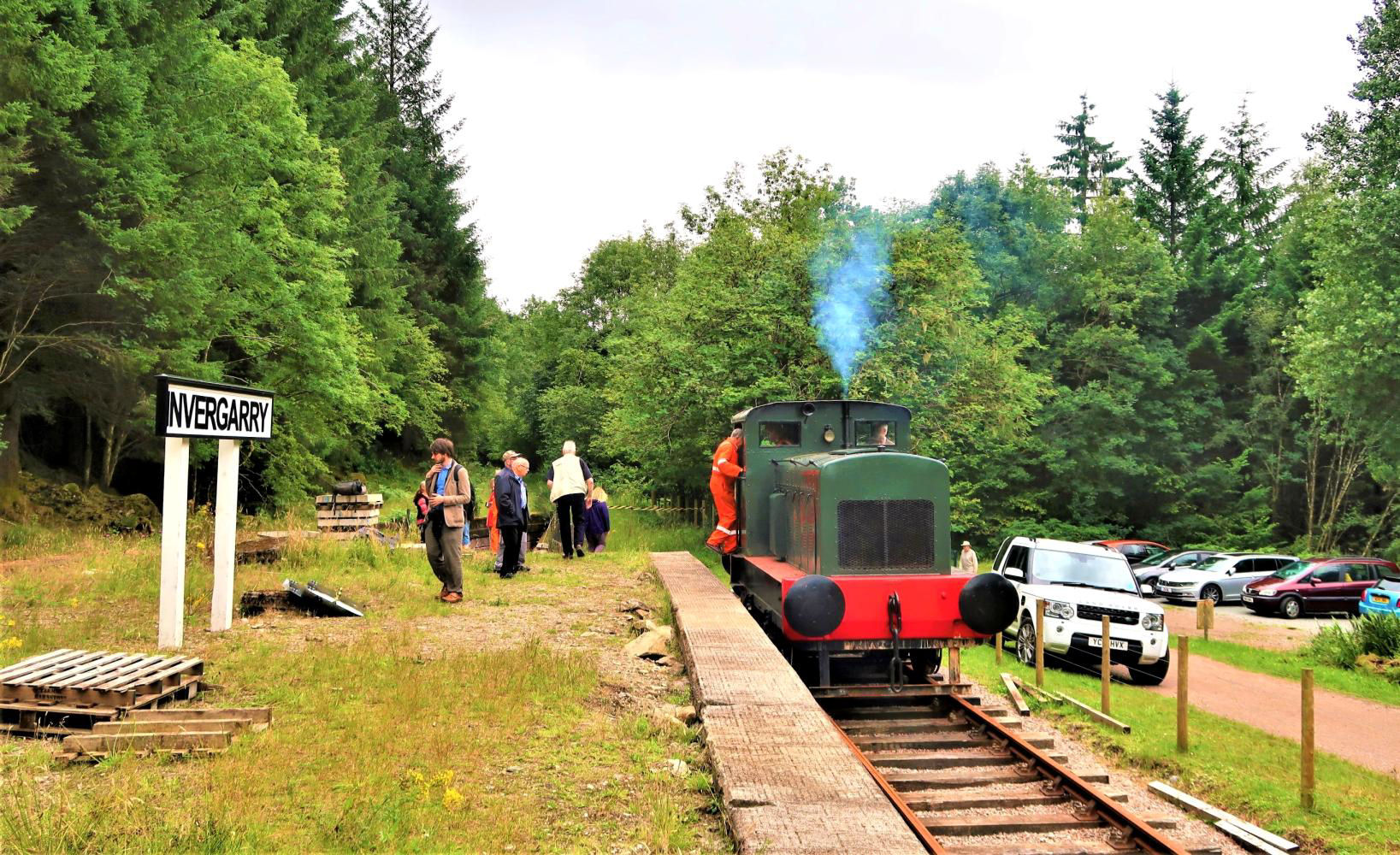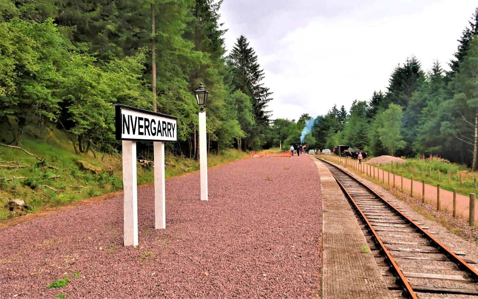Invergarry station was built close to Invergarry House (now the prestigious Glengarry Castle Hotel) - the home of the Lairds of Glengarry - King Edward VII visited in the royal train. A private waiting room was provided for visitors to the house; the Stationmaster's House survives as a private residence. Members initially explored the site (many walking the trackbed footpath, north and south), the rolling stock and railway museum. Relics therein included hand lamps, flags, traffic notices, rule books, Permanent Way and signals tools, photographs and timetables, all with a Scottish flavour. Tyndrum Upper signal frame was donated by NR. The platform has two replica nameboards and concrete foundation base for a signal box; the passenger subway/underpass has been repaired and painted. The Forestry Commission as landlord has agreed to a 48ch south extension and a shorter one north.