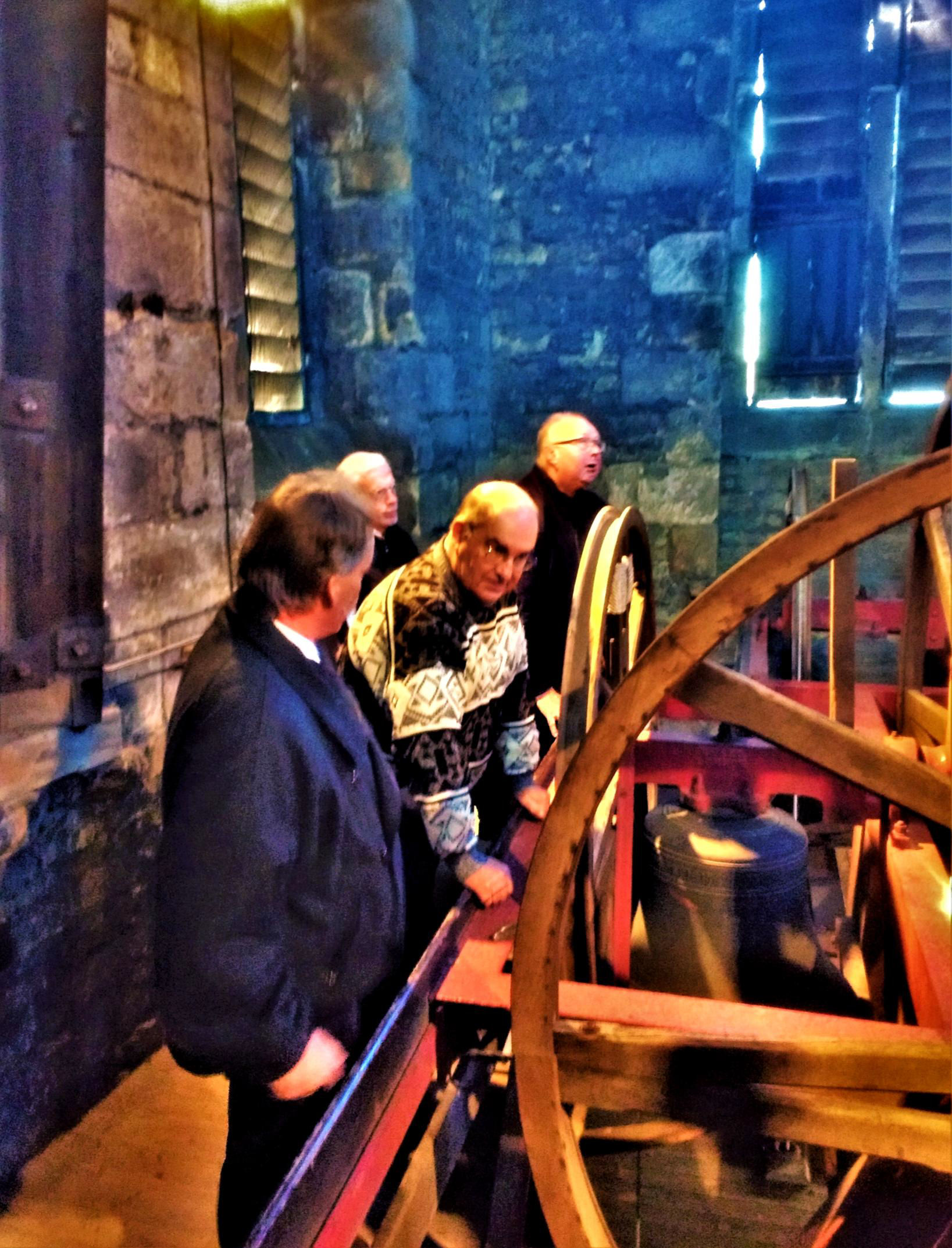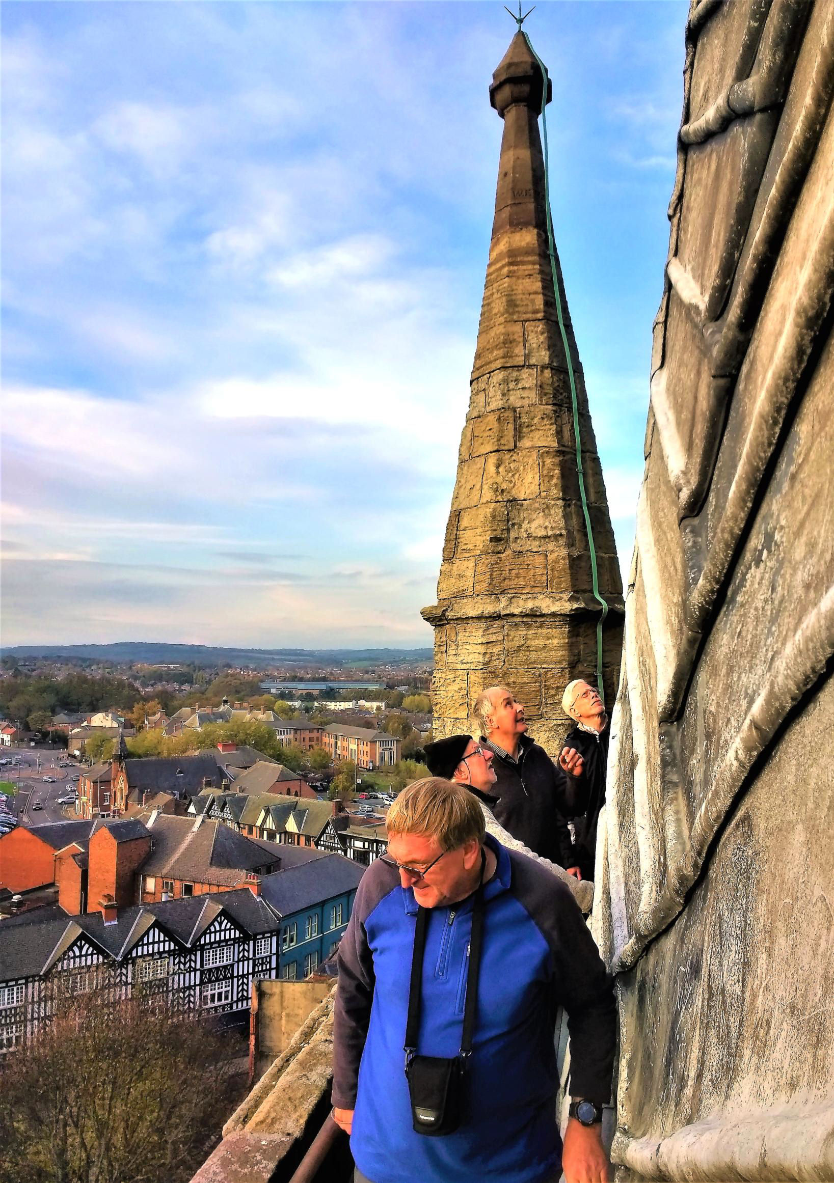 Back at the station, we saw George Stephenson' statue; he is buried in the town. After a lunch break most met up at the famous Grade I Listed church of St Mary & All Saints, with its crooked spire and we had a fascinating two hour guided visit, making it up to the top of the tower via very narrow 156 step spiral staircases (some participants were a bit out of gauge). It is the world's only true crooked spire (both bent and twisted but we were not joined by the local crooked man) and there were great views from the balcony on this lovely sunny warm day. We could see that Chesterfield is in a 'basin' and the various railway routes. The party saw the bells and learnt the real reason for the spire's crookedness.