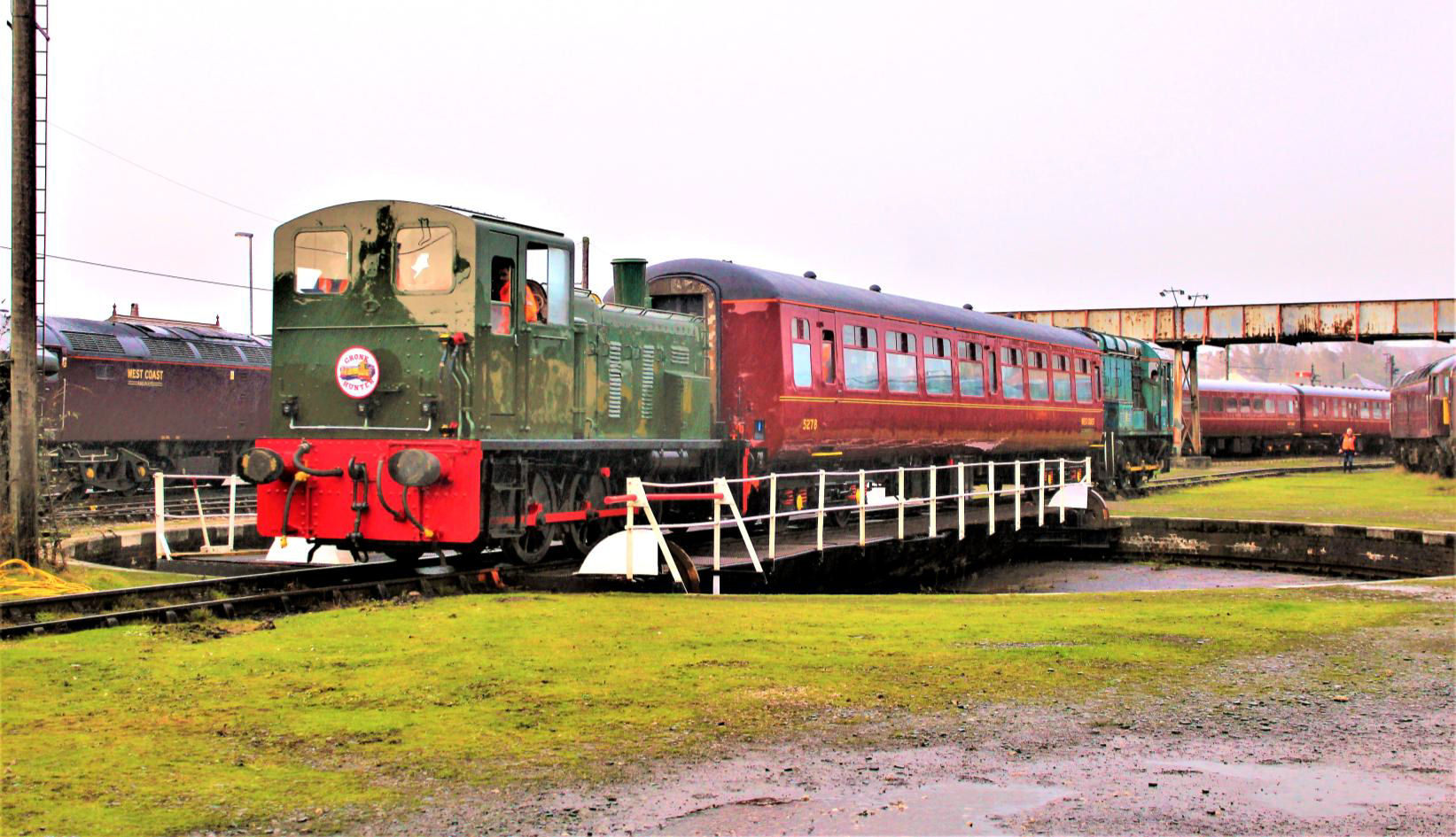 The day started dry, and our journey to Carnforth was uneventful. The West Coast Railways Carnforth depot entrance was guarded by a couple of intrepid BLS volunteers, who ensured that only authorised people were allowed in through the gate. Orange vested people were stationed at strategic points along the internal roadway, and cars were being shown to parking spaces near the depot. There were more stewards on the platform to make sure that everyone knew where space was available. On the west side of the platform, a festively decorated train set was open, and Gravy Train were performing wonders in the buffet car, providing hot drinks and snacks. Mark 2A Tourist Standard Open, 5278 'Melisande', was waiting for us on the east side of the platform.