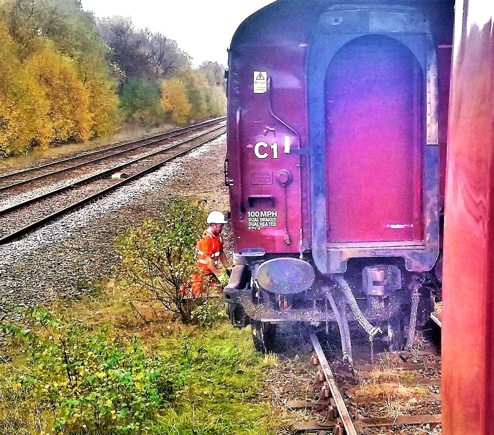 After Dee Marsh North Jn (formerly Birkenhead Jn) we entered Birkenhead Sidings at the stipulated 5mph and noticed that the ride became rough. The train stopped promptly as the emergency brake PassComm had been pulled by one of our trained stewards in Coach B. The front wheel set (only) of the leading bogie of Coach B had derailed to the side. Fortunately there were no injuries due to the low speed (indeed the very reason for taking these lines at slow speed) and, after checking everyone was OK, the train crew gathered trackside to confirm what had happened and to make the necessary calls to Network Rail. The local Mobile Operations Managers were soon on site and Wigan 'BRUFF' re-railing team was called to assist. Unfortunately this headshunt is now a dead end rather than a loop.