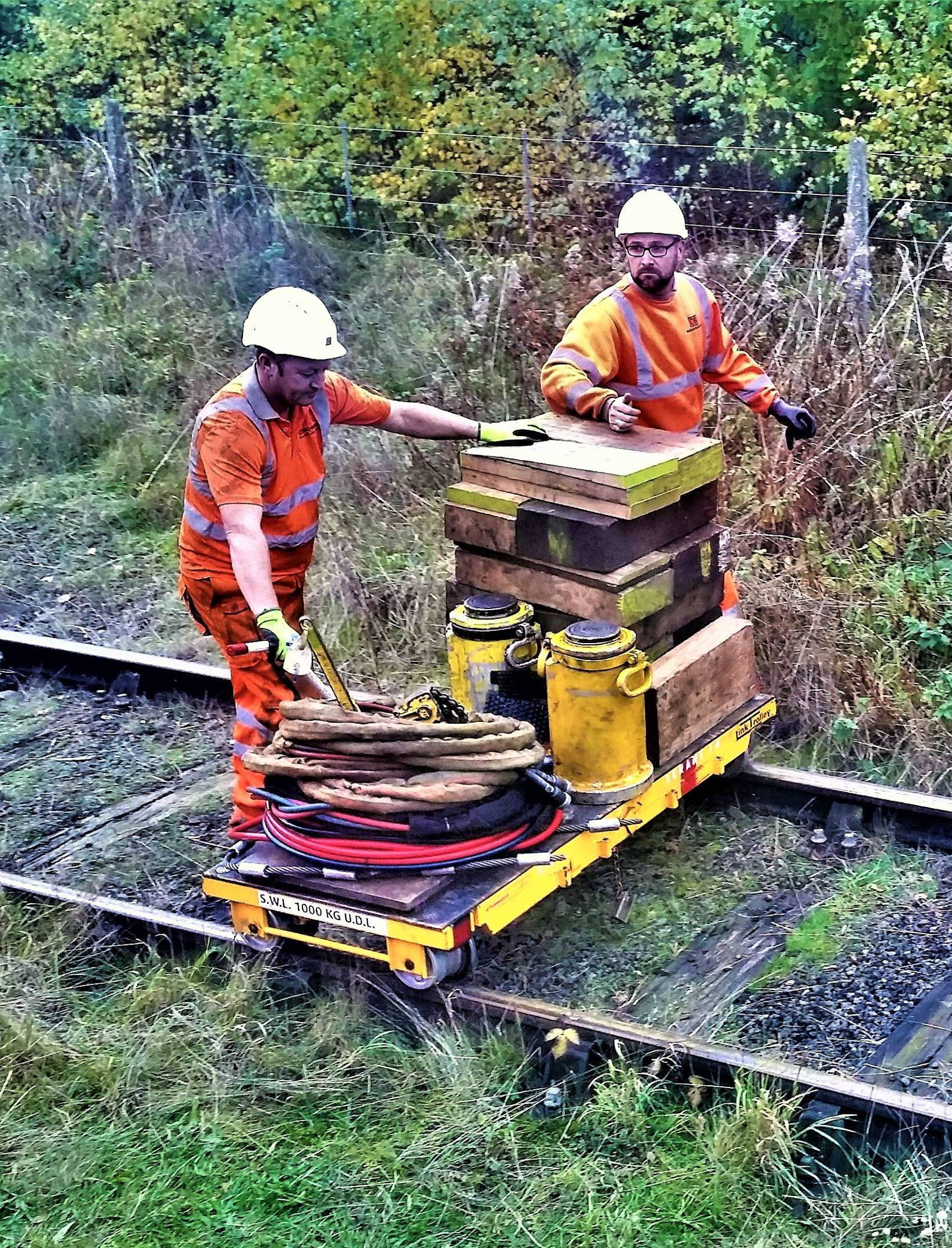 The teams deliberated various ways to recover the situation, from detraining passengers to arranging road transport at the nearest access point. Both options were discounted, and it was decided to run the rear non-derailed Coach A with half the participants and the Class 33 back to Wrexham General to transfer passengers to service trains. This was to be repeated for the remaining participants. Once the Class 33 had departed, the rest of the passengers in the derailed coach were moved back to Coach C so that Coach B could be detached. The two other coaches with the passengers were then drawn forward away from the derailed one by the Class 47 so the BRUFF guys could start re-railing work. This involved four hydraulic jacks and wooden blocks as packing. After just an hour, the coach had been raised, moved across and lowered safely back onto the tracks - very professional and impressive work.