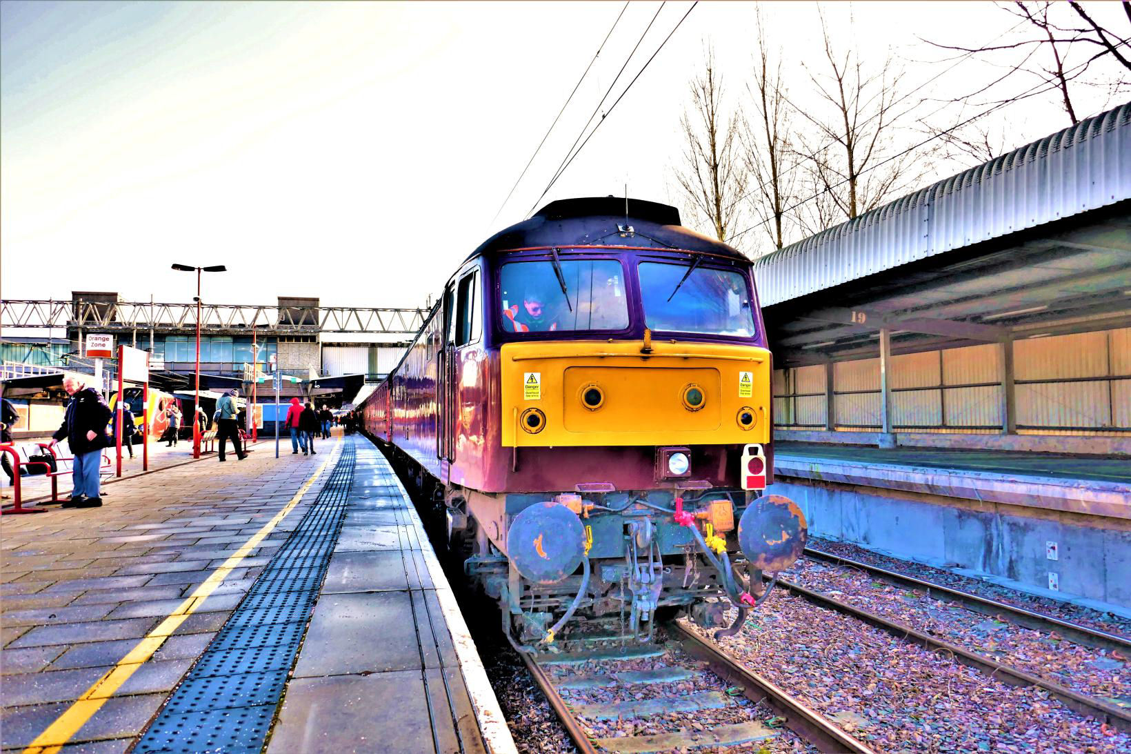 At 13.15 on 2 Feb the rather less well known, 47772, pulled into P12 in the sun, sporting 'Brush Type 4 Fund' and the red with silver lettering 'Branch Line Society' headboards. This 'Birthday Brush' (build date 1 Feb 1965) celebrated its 54th birthday the previous day. It carried four different numbers over the years and was named 'Sir Gwynedd/County of Gwynedd' from 31 Oct 1982 to 22 Dec 1993. At the rear, 47826 the younger brother, at only 53 years old, had also carried four different numbers and was named 'Springburn' 10 May 1989 - 3 Oct 1990; 31 Oct 2001 - 31 Jul 2007 & 16 Jun 1987 - 10 May 1989.
