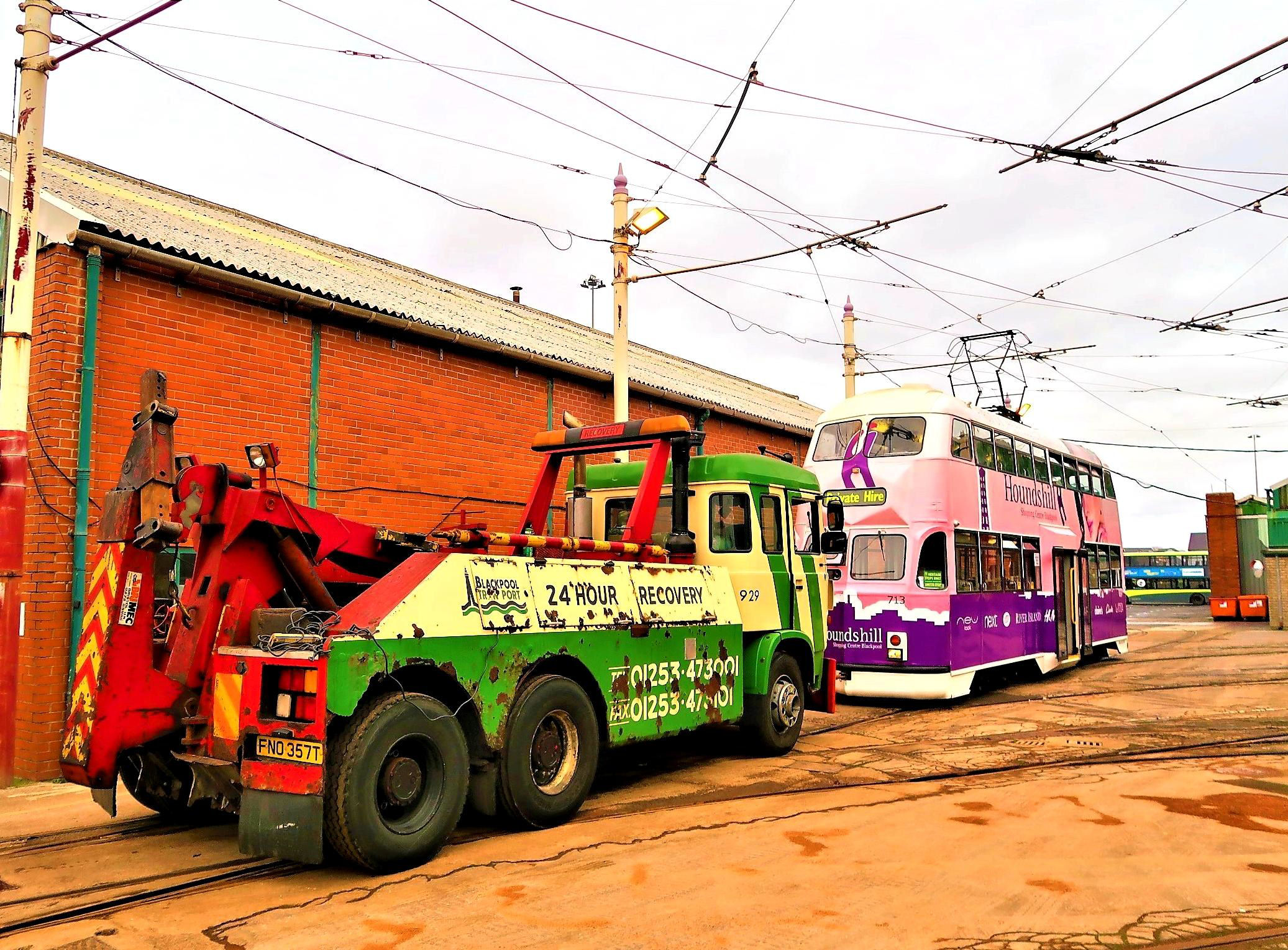 Blackpool No929 is an ERF 'B Series' recovery truck, able to attach a tram coupling bar. Thus equipped, it was used to push our tram around the direct curve into the depot and through 270 degrees left round to the Paint Shop doors, returning back to the tram sheds. This was another non-wired section most thought they would never do. The unusual combination of road and rail together was a first for many, even bringing out tram staff for a photo. A short break was taken to look at the heritage fleet and take a few photos before heading to North Pier by more conventional means and a lunch break.