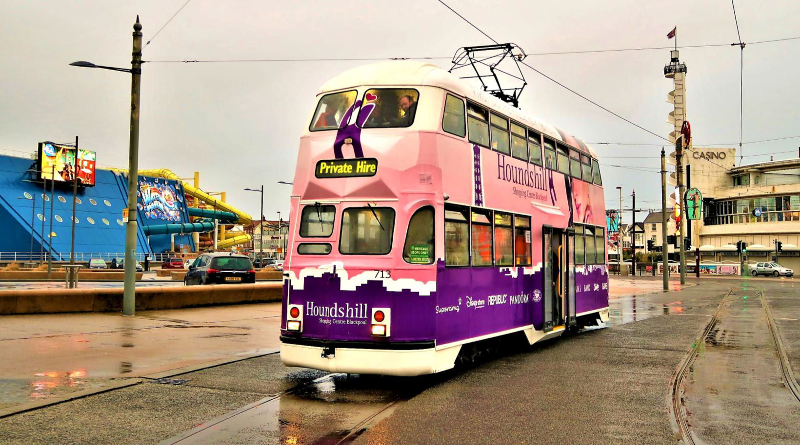 Our tour tram outside Blackpool Rigby Road Depot, the line in the distance curves right (and becomes double track) heading towards the promenade.