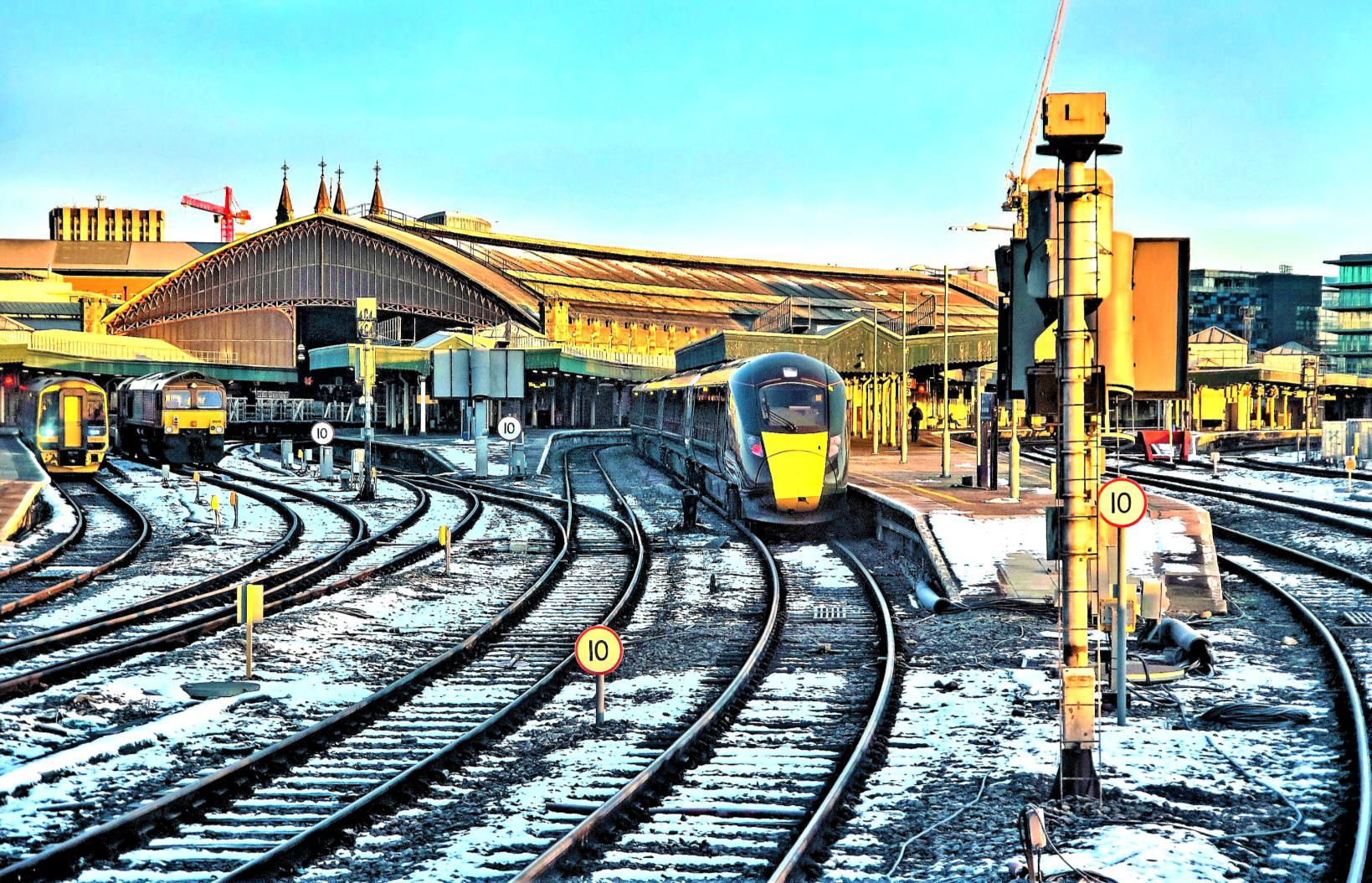 View of the south end of Bristol TM with snow and sun, seen from the loco cab.