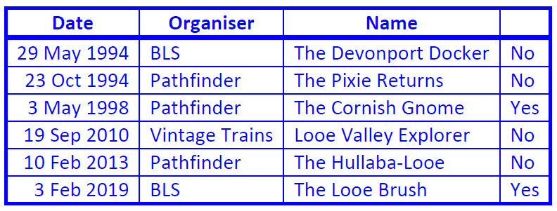 There have only been a handful of tours to Looe over the past 25 years (they have to run on a winter Sunday when there is no passenger service) of which only one in that period covered the much sought after strategic connection at Liskeard with passengers on board ('Yes' in the table)...