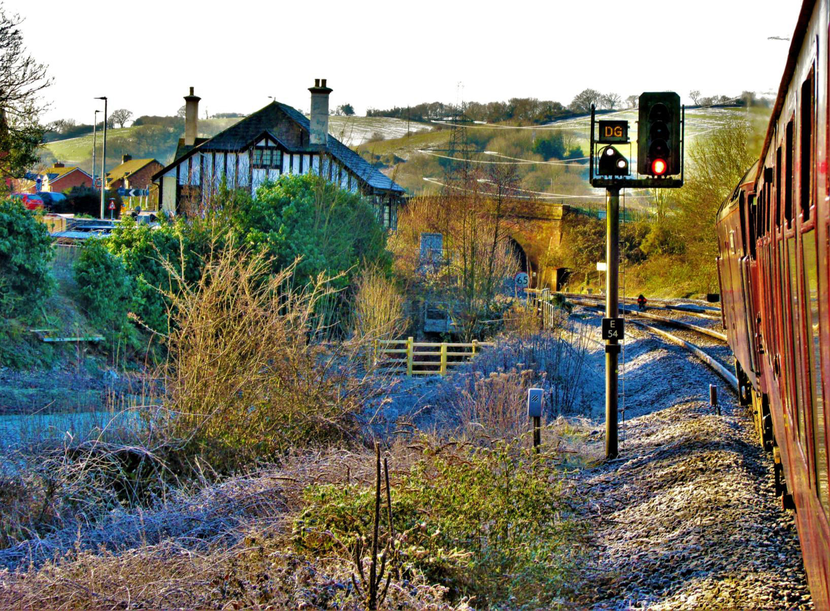 Taken when the train was stationary on a cant; a cold and frosty Devon morning. Approaching Cowley Bridge Jn, the Down Goods theatre light and elevated shunt signal are 'off'.