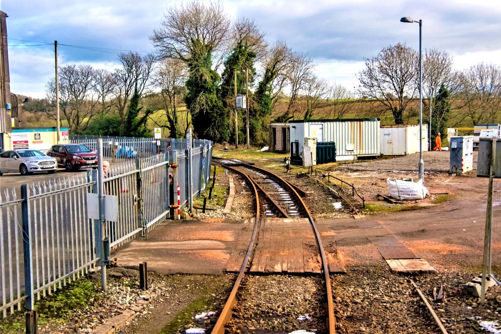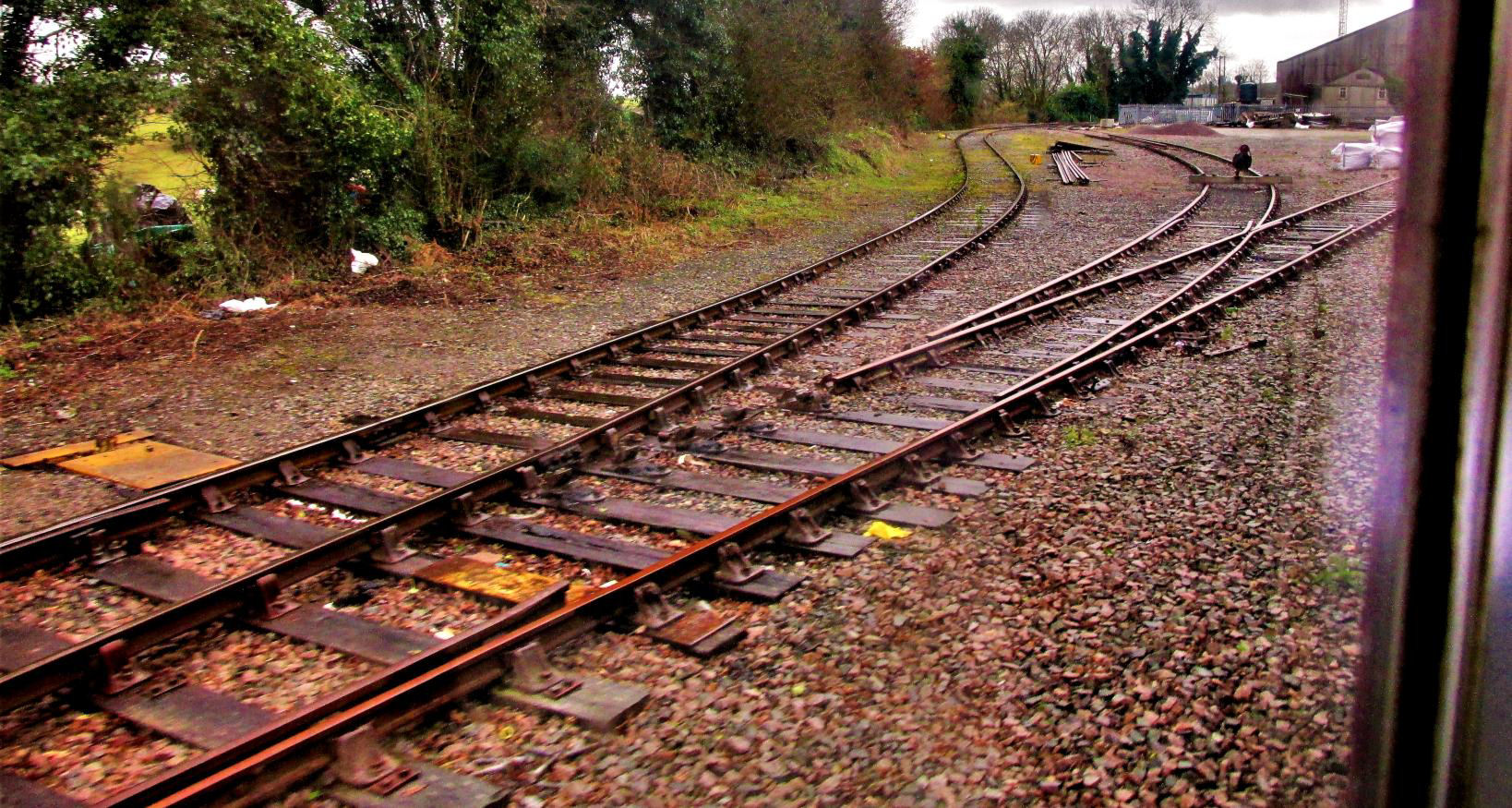 OOU track, the former loop on the connecting line and ex-Cornwall Farmers' terminal siding (off right) taken from inside the train arriving at Liskeard bay P3.