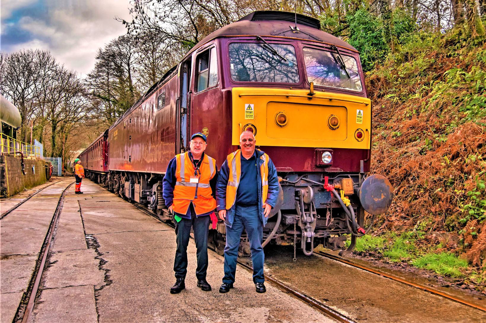 Train crew and front of the train at Moorswater Cement Terminal (taken by authorised staff).