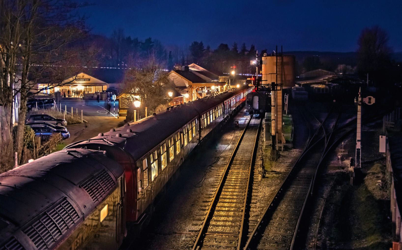 We left Plymouth on time, noting at Hemerdon that the Up Goods Loop was shiny. We descended Rattery Bank and entered Totnes for a run to Buckfastleigh (returning in the dark) covering another rarely used strategic connection, to the South Devon Railway. The 25 min Buckfastleigh break was just enough time for some to buy food or drink from the café just outside of the station. Six of our eight coaches fitted in the platform which doesn't see many, if any, Class 47 locos, let alone two at once!