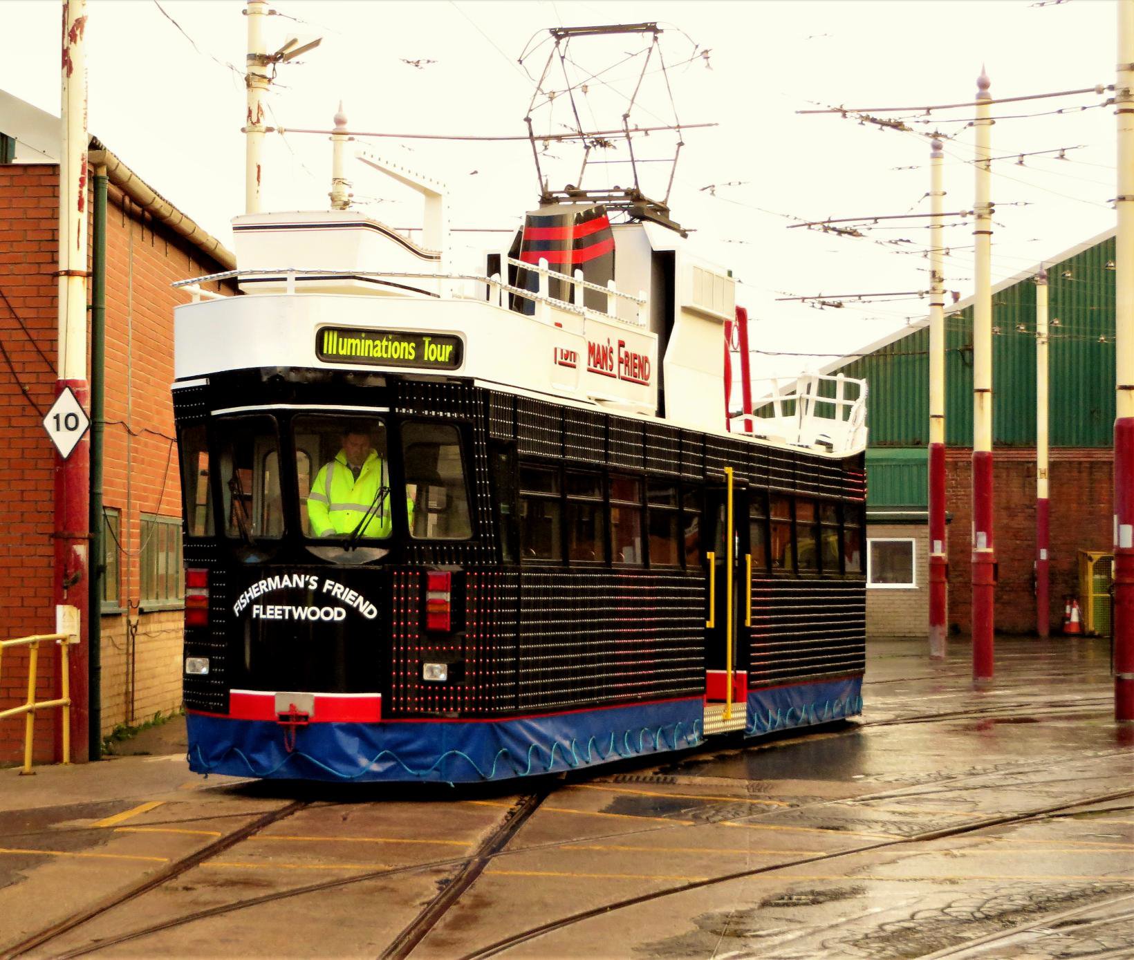 We could have done without the shower of rain and hail, but to our rescue and appropriately named 'Fisherman's Friend Fleetwood' (this was not coincidental!) tram 737 sailed out from the depot, stopping near the entrance. The driver opened the doors and it was 'all aboard'; we even had our Rod with us (from Carlisle).