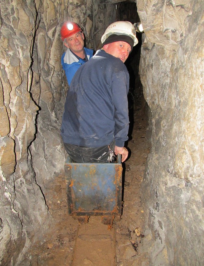 The things some people will do for track⦠Alan has been Shepherded into a tiny tub and is being pushed about by John Cameron underground in the Goodluck Vein.